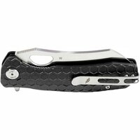 Покрытие рукоятей – нейлон, армированный стекловолокном. Рукоять сатинирована, то есть обработана абразивом, и устойчива к скольжению. Изогнутый клинок с отверстием для удобства захвата, скошенной острие. Карманная клипса.