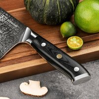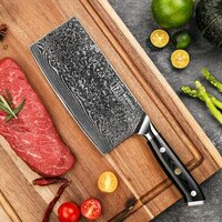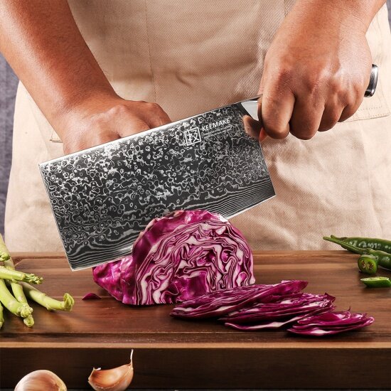 Профессиональный топорик кухонный Keemake CJ-1 серии Blue Gem разработан специально для выполнения силовых задач и применения ударных техник при разделке птицы, рыбы или мясных тушек. Благодаря тщательно подобранным размерам и оптимально сбалансированному весу, эти кухонные принадлежности становятся незаменимыми при рубке мяса, измельчении костей и хрящей. Длина клинка составляет 178 мм, а ширина 84 мм, что позволяет эффективно контролировать процесс, когда вы используете нож топор. Кухонные ножи Keemake также можно использовать как лопатку для удобного перекладывания нарезанных продуктов с доски в миски. Ножи кухонные от Keemake представляет собой премиальные профессиональные инструменты, созданные по традиционной дамасской технологии. Усиленный нож из дамасской стали оснащен сердечником из высокоуглеродистой стали V Gold-10, который обеспечивает высокую твердость по шкале Роквелла – 60 HRC. Нож топорик кухонный Keemake предназначен не только для разделки мяса, но и для быстрой нарезки корнеплодов и зелени. Сердечник из высокоуглеродистой стали VG-10, который получили ножи кухонные профессиональные серии Blue Gem, окружен 67 слоями дамасской стали с добавлением кобальта, ванадия и других элементов. Многослойная структура, которую имеют ножи для кухни, формирует уникальный рисунок на боковых гранях, который привлекает внимание своей эстетичностью и художественным оформлением. В процессе производства тесак кухонный Keemake CJ-1 проходит вакуумную термическую обработку с отпуском после закалки, что улучшает его твердость, вязкость и общие характеристики. Лезвие топорика обладает исключительной остротой и симметричной заточкой, выполненной на водных камнях высокой зернистости под минимальным углом по обеим сторонам. Благодаря этому товары для кухни сохраняют свою остроту долгое время и обеспечивают легкость при резке. Эргономичная рукоятка овального сечения, которой дополнены ножи из дамасской стали, удобно ложится в руку, предоставляя полный контроль над процессом реза. Эта эффектная рукоять из серии Blue Gem выполнена из качественной эпоксидной смолы, отполированной до блеска, что делает необычные ножи похожими на драгоценные камни. Изумрудный перелив с глубокой текстурой усиливает стильный вид, который имеет тесак - нож кухонный профессиональный от Keemake. При взгляде на такой нож для мяса, на ум приходя волны и песчаные дюны. Материал рукоятки гипоаллергенен и чрезвычайно тверд, что делает нож поварской серии Blue Gem устойчивым к ударам, трещинам и интенсивному использованию. Рукоятка легко чистится и сохраняет гладкость поверхности. Декоративный мозаичный пин из меди придает ручке изящный и стильный вид, добавляя топорику из серии Blue Gem характерный шарм. Нож для разделки мяса в виде топорика оснащен полным хвостовиком (фултанг), что обеспечивает равномерное распределение веса и контроль. Рукоять плавно переходит в стальной больстер, который соединяется с лезвием, создавая оптимальный баланс и улучшая гигиену защищая нож тесак от накопления бактерий в стыках. Кухонный топорик от Keemake, а также любой нож поварской профессиональный серии Blue Gem отличаются изысканным дизайном, высочайшим качеством и превосходными эксплуатационными характеристиками. Этот топорик станет незаменимым помощником на любой ку Общая информация: • Название: Топорик • 