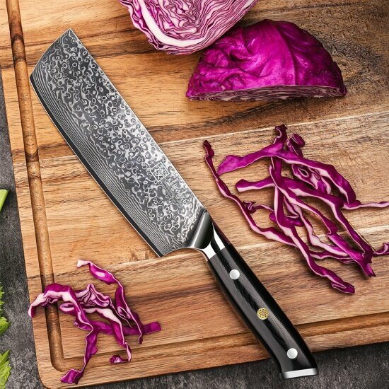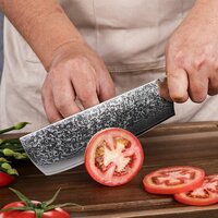 Профессиональный кухонный нож накири от Keemake – это премиальный нож серии Classic, изготовленный по старинной дамасской технологии с сердечником из высокоуглеродистой стали V Gold-10 и высокой твердостью по Роквеллу – 60 HRC. Нож накири предназначен не только для нарезки фруктов и овощей, но и для быстрой шинковки всех видов корнеплодов, а также подходит для мелкой нарезки мяса и зелени. Нож накири от Keemake имеет широкой клинок с тонкой режущей кромкой и сбалансированный вес. Широкий клинок длиной 178 мм позволяет не только уверенно работать с луком или листьями салата, но ему по силам и тыква, и редька дайкон, и мясо, и рыба, а также другие продукты гастрономии. Кроме того, клинком можно работать и как лопаткой для перекладывания нарезки с разделочной доски в миски.