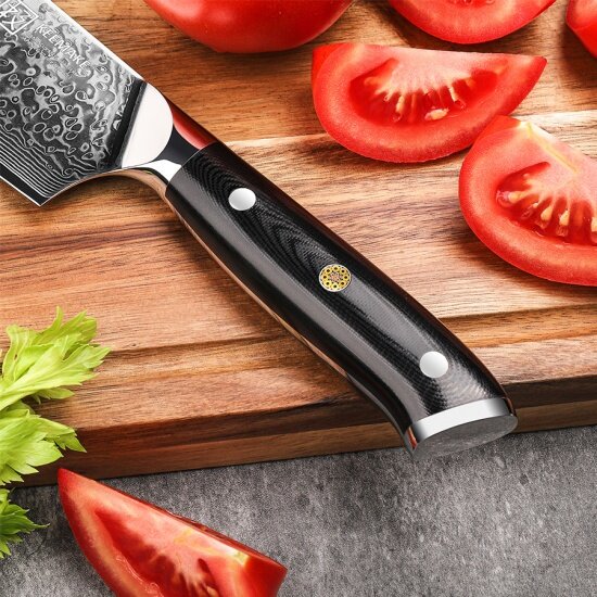 Эргономичная рукоять овального сечения комфортно ложится в руку и даёт полный контроль над процессом реза. Рукоять ножа Keemake из серии Classic выполнена из очень прочного, влагонепроницаемого и ударостойкого композитного материала, который прекрасно дополняет характерный стиль клинка из дамасской стали. Материал является гипоаллергенным и очень твердым, что делает рукоятку устойчивой к сколам, растрескиванию и интенсивному использованию. Рукоятка ножа Keemake легко чистится и сохраняет гладкую поверхность. Мозаичный пин из качественной меди украшает рукоять, создавая мягкий и изящный образ ножей из коллекции Classic.
