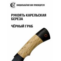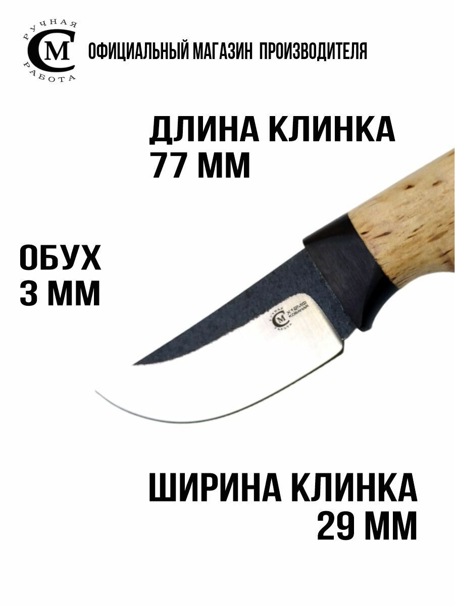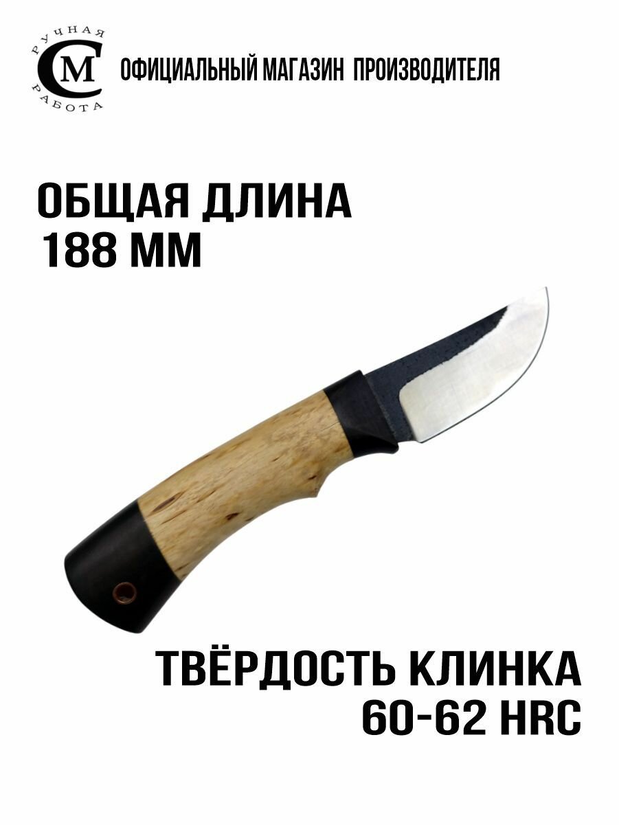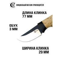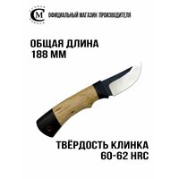 Рукоять ножа выполнена из дерева, что делает его удобным в использовании и предотвращает травмы при работе с ним. Лезвие имеет форму Drop-Point, что позволяет легко разрезать мясо и другие материалы.