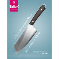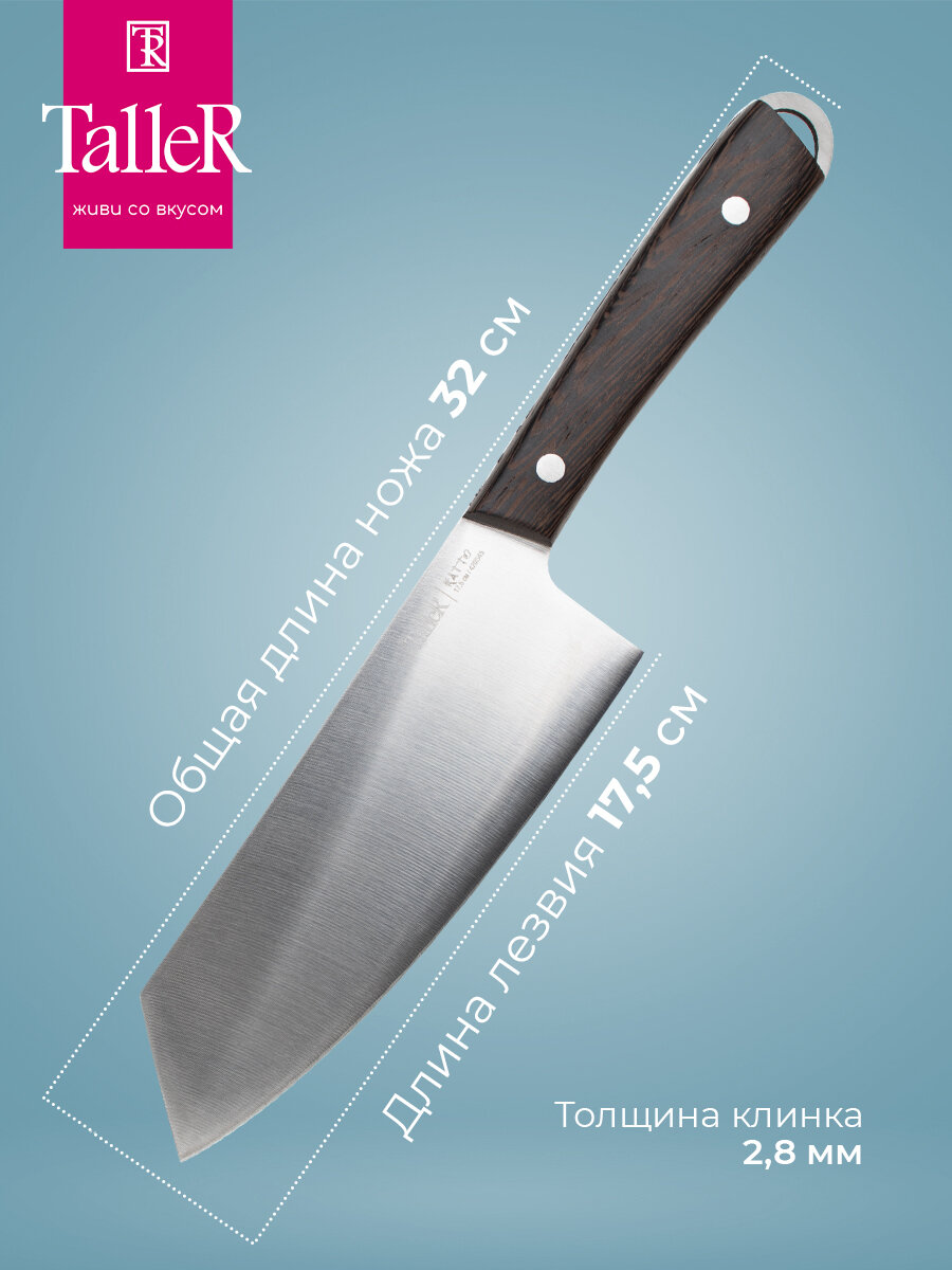 Нож топорик от бренда TalleR - это высококачественный инструмент для резки мяса, рыбы, овощей и фруктов. Он имеет длину лезвия 17,5 см и оснащен петлей для подвешивания, что делает его удобным в использовании на кухне.