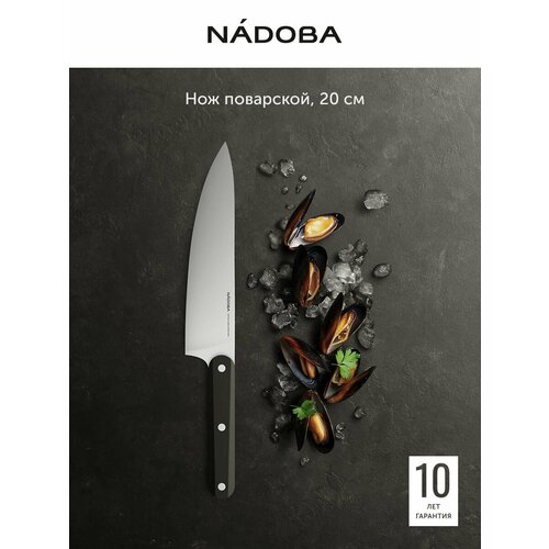 Если вы ищете практичный и стильный подарок для близких или желаете обновить свои кухонные принадлежности, обратите внимание на наш кухонный нож поварской. Этот нож поварской профессиональный создан для тех, кто ценит качество, удобство в приготовлении пищи. Поварской нож станет прекрасным украшением кухни и незаменимым помощником в готовке. Нож кухонный профессиональный оснащён эргономичной ручкой, обеспечивающей надежный хват и комфорт даже при длительном использовании. Особое внимание стоит уделить качеству материалов. Лезвие изготовлено из высококачественной нержавеющей стали 30Cr13 твердость 56-58 единиц по Роквеллу, устойчивой к коррозии и сохраняющей остроту даже после многократного использования. Нож профессиональный поварской имеет кованый клинок, что придаёт ему дополнительную прочность и долговечность. Такие ножи острые легко справятся с нарезкой мяса, овощей, картошки, капусты, рыбы, сыра, томатов, а также подойдут для чистки и разделки продуктов. Поварской нож профессиональный можно мыть посудомоечной машине, посудомойке, ПММ. Хотя шеф нож кухонный разработан с учётом профессиональных требований, шеф нож кухонный профессиональный отлично подойдёт и для домашнего использования. Идеален как для опытного повара, так и для начинающей хозяйки. Такой ножик кухонный станет отличным выбором на день рождения, Рождество или Новый год, новоселье. Ножик обязательно порадует не только практичностью, но и внешним видом. Нож шеф упакован в стильную коробку, поэтому не требует дополнительной упаковки. Подходит в качестве презента маме, девушке, бабушке, мужчине или другу, увлекающемуся кулинарией. Мы предлагаем только лучшие товары для кухни и дома. Нож шеф кухонный от Nadoba – это высокое качество, продуманный дизайн и долговечность. Вы можете быть уверены, что этот шеф нож профессиональный прослужит долгие годы, не теряя своей функциональности и внешнего вида. Пусть готовка станет удовольствием, а каждый день на кухне — маленьким праздником. Сделайте выбор в пользу настоящего качества – подарите себе и близким нож шеф кухонный профессиональный, которые прослужат не один год.