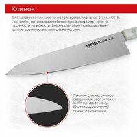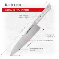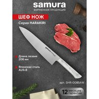 Шеф-нож главный клинок на каждой кухне. Входит в знаменитую «поварскую тройку» (вместе с универсалом и овощным ножом) и отличается большим размером и многофункциональностью. С его помощью можно выполнить большую часть работ по разделке, нарезке, измельчению продуктов, в том числе с высокой плотностью. Им удобно разделать курицу или кролика, отсечь голову рыбы и нарезать стейки, превратить мясо в рубленый шарф прямо на доске, совершать повседневные манипуляции отрезать колбасу и сыр для бутербродов, измельчать ингредиенты для первых и вторых блюд, салатов и закусок. Наиболее широкая часть лезвия у основания, подходит для грубых работ, а узкий заостренный кончик предназначен для измельчения небольших продуктов (грибов, чеснока, перца). Центральная часть наиболее универсальна для стандартной нарезки ломтиками, кусочками, кубиками. Кухонный нож из коллекции Samura Harakiri отличается легким весом и доступной ценой. При изготовлении используются недорогие, но качественные и прочные материалы, производство массовое. Такой подход позволяет получить добротный клинок с высокой работоспособностью по самой низкой цене среди шефов бренда. Шеф-нож Harakiri имеет однослойное лезвие из популярной японской стали AUS-8. Благодаря добавлению в сплав ванадия, молибдена, марганца и других компонентов, металл обретает умеренную вязкость и высокую коррозиестойкость. Режущая кромка закалена до твердости 58 HRC и доведена на водных камнях до бритвенной остроты. Долгое время не нуждается в правке и заточке, а при необходимости осуществить эти работы не составит труда в домашних условиях. Рукоять имеет лаконичный дизайн и отлично вписывается в светлый интерьер кухни. Изготовлена из ABS-пластика, который не впитывает воду, загрязнения и пищевые соки, легко моется. Материал жаропрочный и легкий, не разбухает и не деформируется. Нож не скользит даже во влажной ладони и комфортно ложится в руку любого размера. Хвостовик лезвия проходит через весь корпус рукояти, а обкладки из пластика надежно фиксируются заклёпками. Недорогие и прочные ножи Самура Харакири подойдут для профессионального и домашнего применения. Не требуют особого ухода и практичны в быту. Достойные клинки по доступной цене.