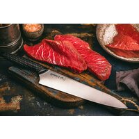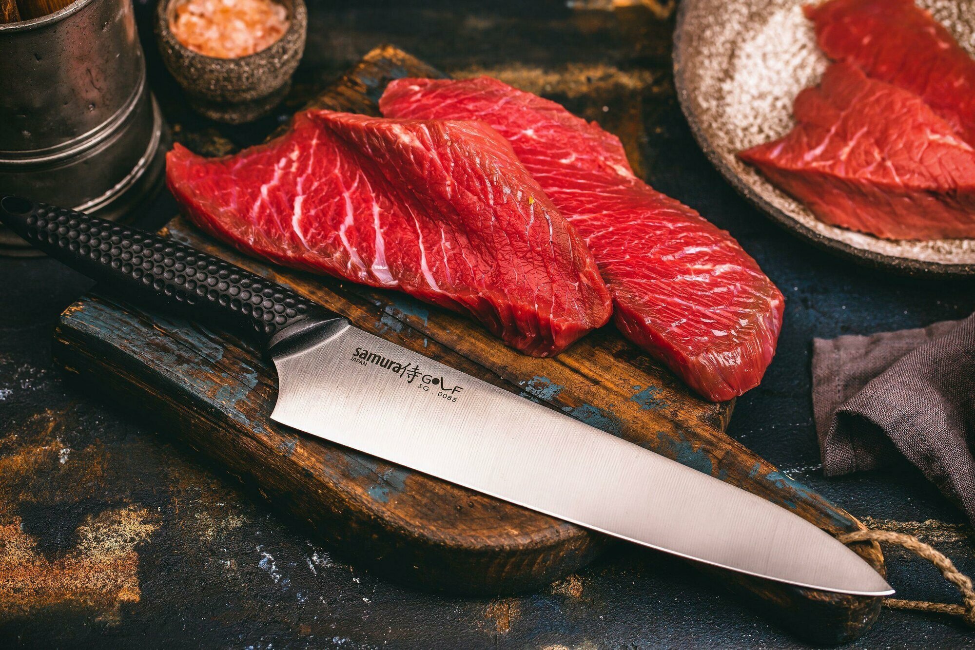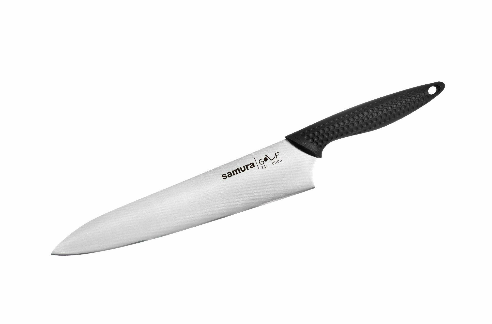 Купить Нож кухонный поварской Шеф 221 мм Samura Golf, нескользящая рукоять, черный с доставкой по всей России.
