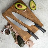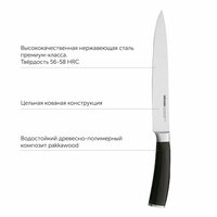Ножи серии Dana изготовлены из высококачественной нержавеющей стали премиум класса, лезвия ножей остаются острыми очень долгое время. Ручки ножей выполнены из кованной нержавеющей стали и прочного водостойкого древесно-полимерного композита Pakkawood. Особенности ножа Материал лезвия: высококачественная нержавеющая сталь Материал ручки: кованная нержавеющая сталь, древесно-полимерный композит Pakkawood Длина лезвия: 20 см Длина рукоятки: 12 см Длина с рукояткой: 32 см Твердость по школе Роквелла 55-57 HRC Упаковка: прозрачная пластиковая коробка с евроотверстием, картонный вкладыш
