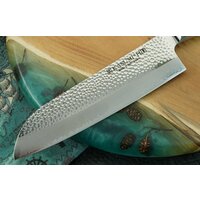 Hammer - одна из самый популярных серий кухонных ножей Kasumi, сочетающая в себе яркий и продуманный дизайн с безупречным функционалом. Главная особенность серии - необычная текстура, напоминающая удары кузнечного молота или лунные кратеры. Выпуклый узор создает воздушную прослойку между продуктом и клинком, уменьшая налипание при нарезке. Длительную остроту ножей Kasumi Hammer обеспечивает твердая японская сталь VG-10, а ручная механическая заточка дает максимально точный и тонкий рез превращающий готовку в настоящее удовольствие. Рукоятка ножей серии Hammer выполнена из полимерного материала, который обладает повышенной стойкостью к истиранию, ударным нагрузкам, а так же к воздействию органических растворителей и масел. Сантоку — это шеф-нож, только несколько иной формы. Его отличает прежде всего лезвие с несколько округлым кончиком. Многие повара по всему миру уже давно оценили удобство таких ножей перед традиционными европейскими шефами. Важным плюсом Сантоку можно назвать несколько больший функционал. Например, переносить нарезанные продукты на нём куда удобнее. Длинна этого Сантоку 18 см что позволяет при готовке им на кухне выполнять любые работы, кроме, разве что, нарезки замороженных продуктов и рубки костей.