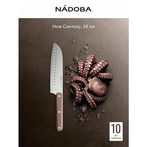 Если вы ищете практичный и стильный подарок для близких или желаете обновить свои кухонные принадлежности, обратите внимание на наш нож сантоку. Этот нож сантоку кухонный создан для тех, кто ценит качество, удобство в приготовлении пищи. Сантоку нож станет прекрасным украшением кухни и незаменимым помощником в готовке. Нож кухонный профессиональный оснащён эргономичной ручкой, обеспечивающей надежный хват и комфорт даже при длительном использовании. Особое внимание стоит уделить качеству материалов. Лезвие изготовлено из высококачественной нержавеющей стали 30Cr13 твердость 56-58 единиц по Роквеллу, устойчивой к коррозии и сохраняющей остроту даже после многократного использования. Нож кухонный сантоку имеет кованый клинок, что придаёт ему дополнительную прочность и долговечность. Такие ножи острые легко справятся с нарезкой мяса, овощей, картошки, капусты, рыбы, сыра, томатов, а также подойдут для чистки и разделки продуктов. Поварской нож профессиональный можно мыть посудомоечной машине, посудомойке, ПММ. Хотя шеф нож кухонный разработан с учётом профессиональных требований, шеф нож кухонный профессиональный отлично подойдёт и для домашнего использования. Идеален как для опытного повара, так и для начинающей хозяйки. Такой ножик кухонный станет отличным выбором на день рождения, Рождество или Новый год, новоселье. Нож поварской профессиональный обязательно порадует не только практичностью, но и внешним видом. Кухонный нож сантоку упакован в стильную коробку, поэтому не требует дополнительной упаковки. Подходит в качестве презента маме, девушке, бабушке, мужчине или другу, увлекающемуся кулинарией. Мы предлагаем только лучшие товары для кухни и дома. Нож для мяса профессиональный от Nadoba – это высокое качество, продуманный дизайн и долговечность. Вы можете быть уверены, что этот шеф нож профессиональный прослужит долгие годы, не теряя своей функциональности и внешнего вида. Пусть готовка станет удовольствием, а каждый день на кухне — маленьким праздником.
