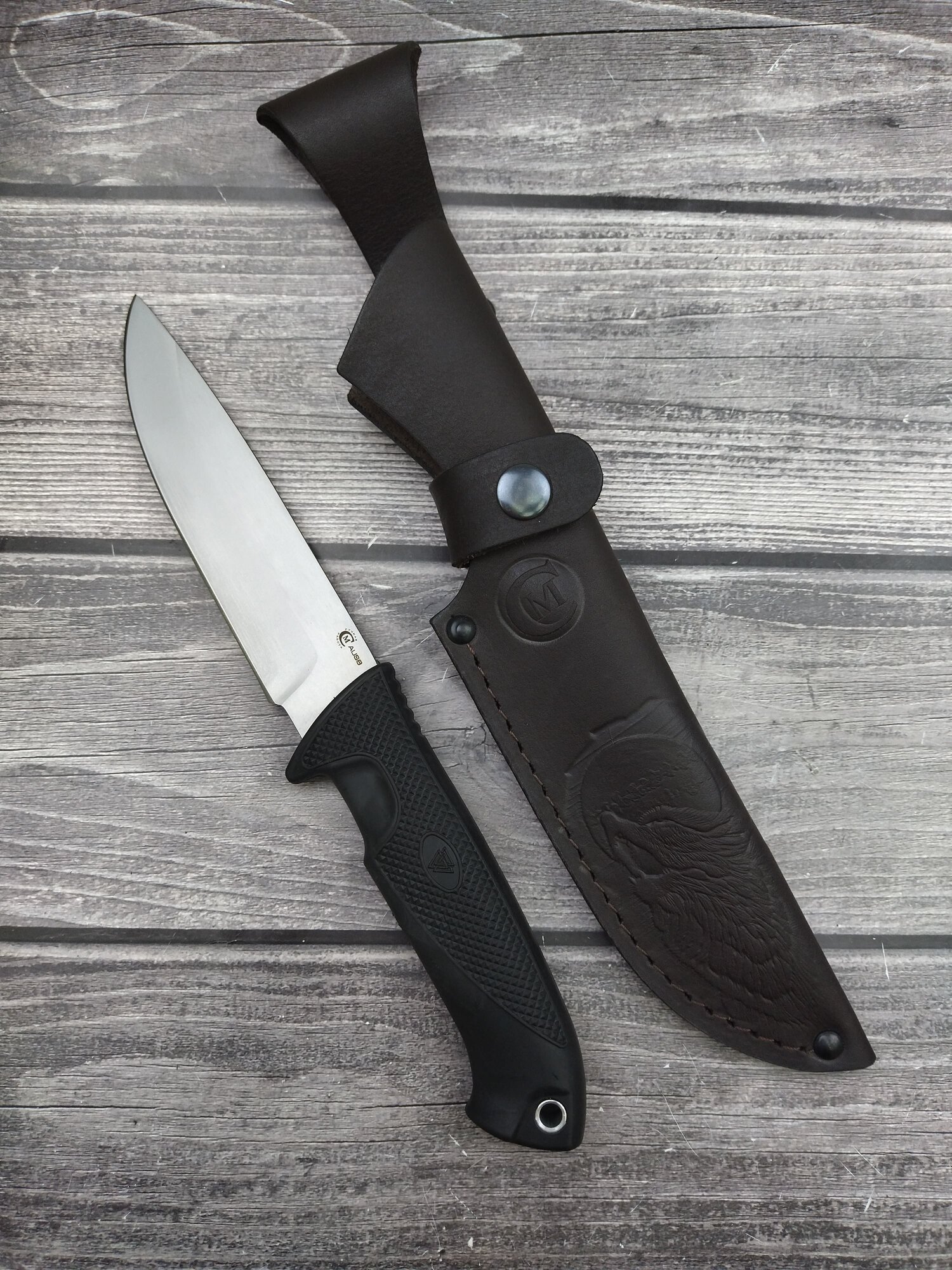 Представлен в стали AUS-8. Долговечность, сохранение остроты и прочности - вот основные преимущества этих материала. Клинок имеет кинжальную форму с обоюдо-острой заточкой обеих сторон. Рукоятка ножа выполнена из ценных пород дерева и имеет эргономичную удобную форму. Нож комплектуется ножнами из натуральной кожи.