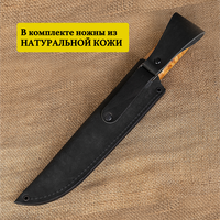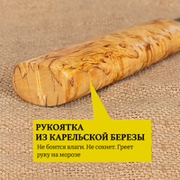 Основные характеристики ножа: Длинна клинка: 130 мм. Материал рукоятки: карельская береза. Длинна рукоятки : 125 мм. Толщина обуха: 3.1 – 3.5 мм. Ширина клинка: 269 мм. Твердость стали 61 HRC. Комплектация: Нож, сертификат, кожаные ножны, картонная коробка.