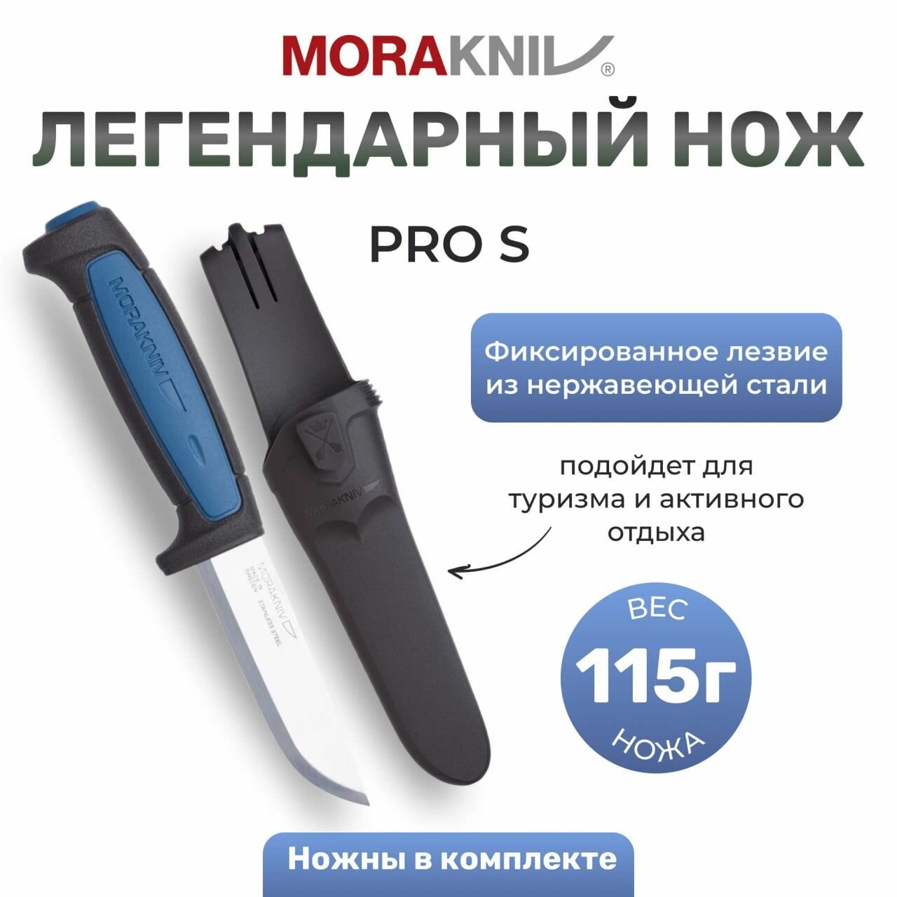 Модель Morakniv Pro S, как упоминалось выше, относится к серии бюджетных ножей, и потому ее цена относительно невысока. Однако, при этом, качество ножа и его характеристики находятся на достойном уровне. Нож оснащен небольшим клинком формы drop-point с прямой заточкой режущей кромки, что позволяет ему одинаково хорошо резать и колоть. Общая длина ножа немного превышает 20 см, а на лезвие толщиной в обухе 2 мм, приходится чуть больше 9 см.
