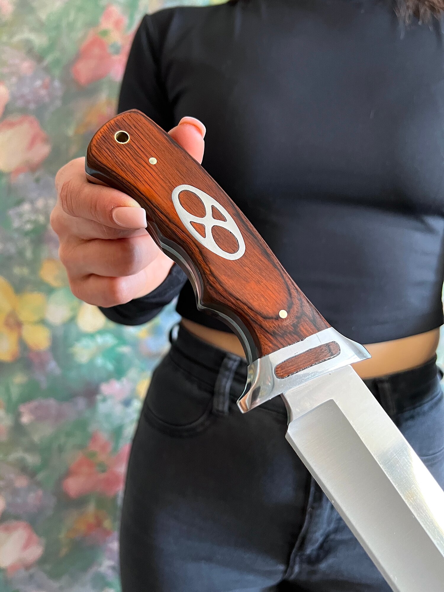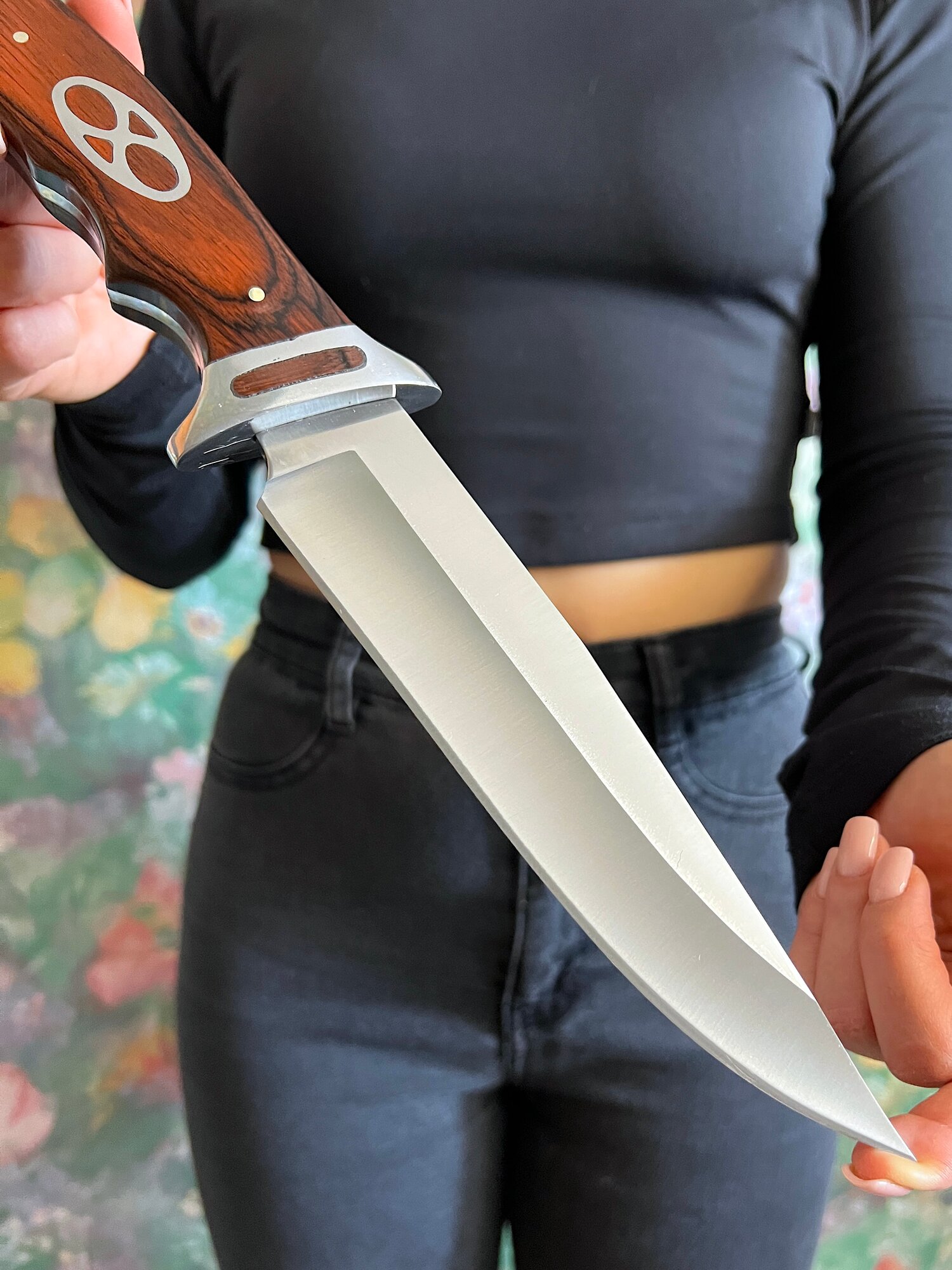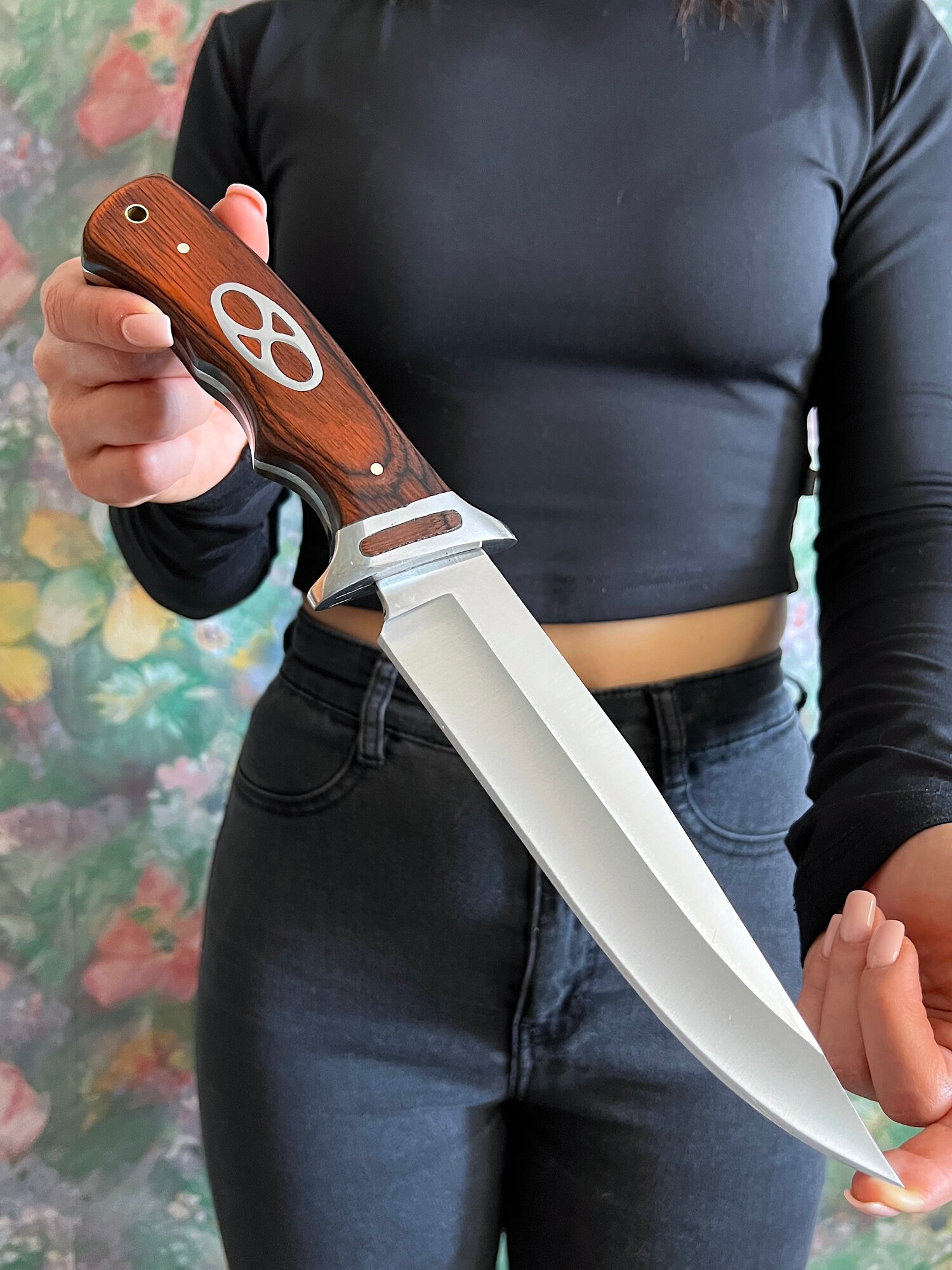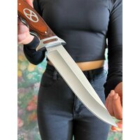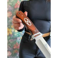 Удобная, деревянная рукоять размером 13 см крепко фиксируется в руке, не выскальзывает при работе даже в экстремальных условиях: в дождь, снег, жару или холод. Идеально сбалансированный вес ножа 329 гр. способствует удобной работе: приготовление пищи, разделки дичи, забоя КРС и тд.