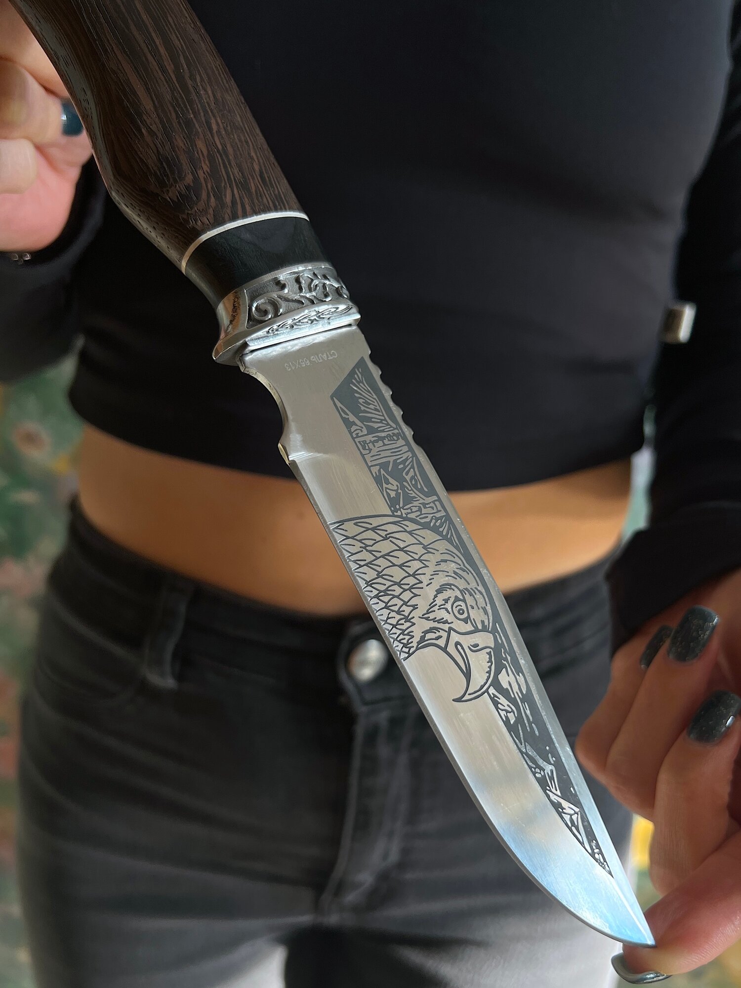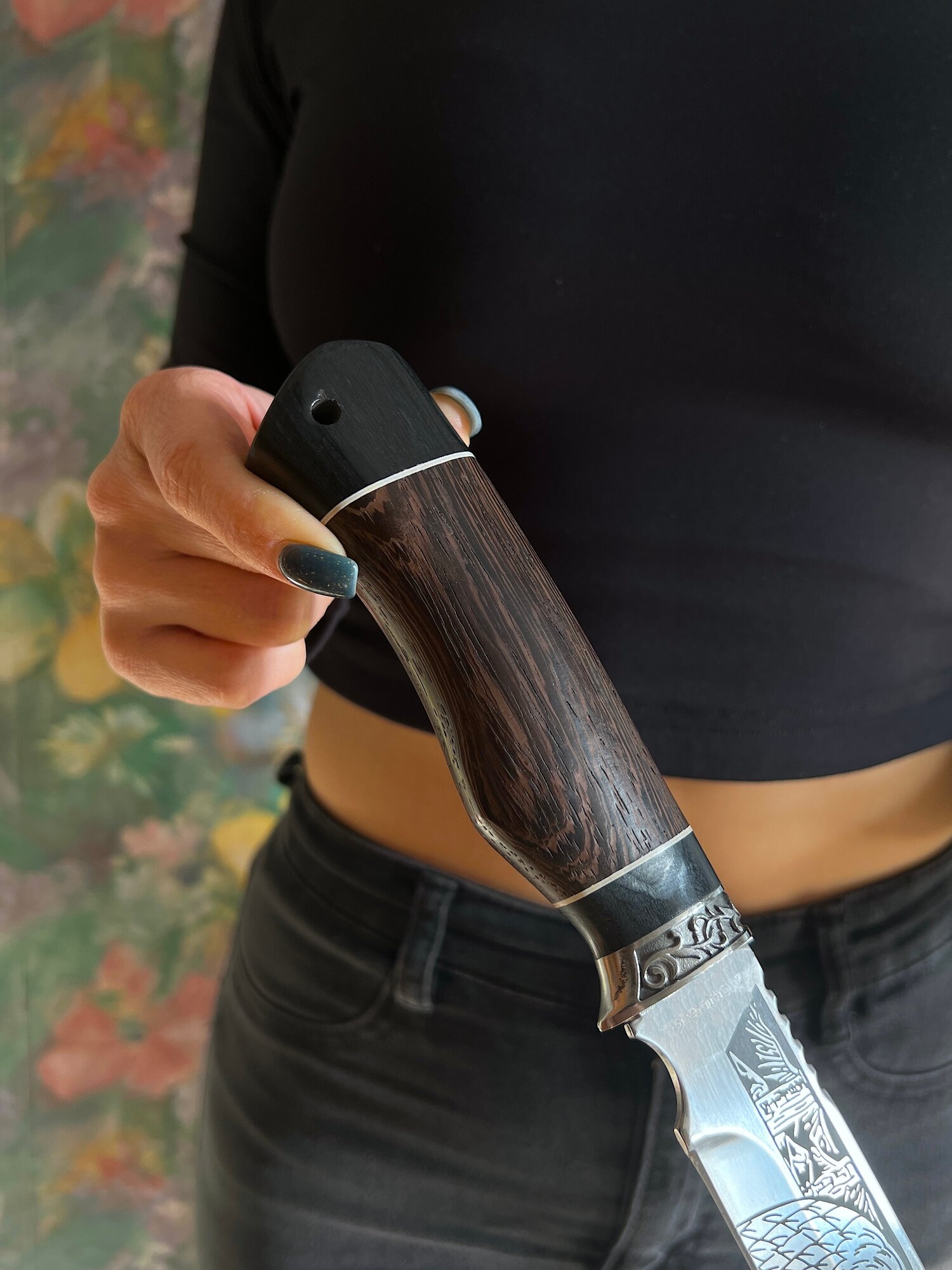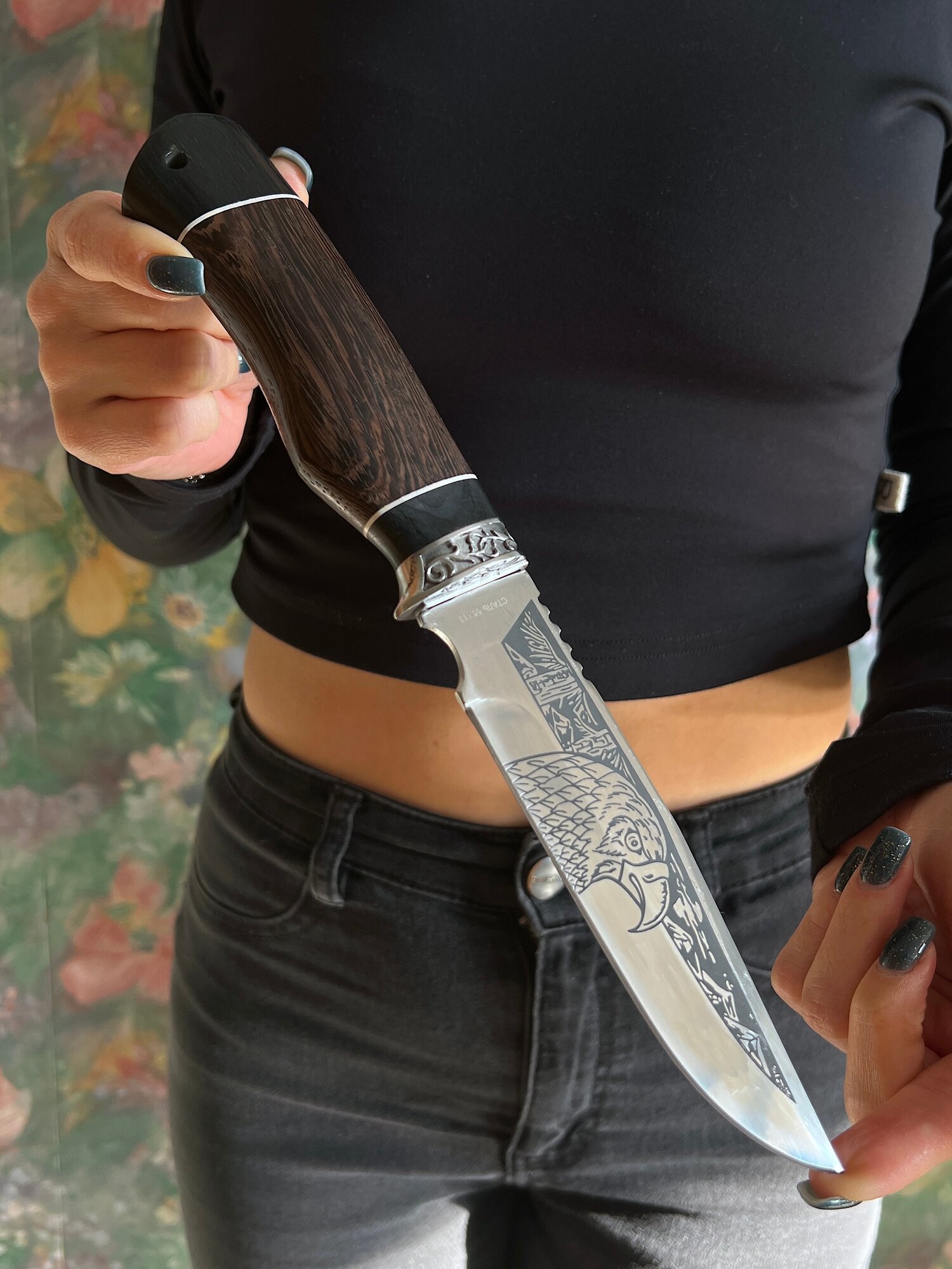 Удобная, деревянная рукоять размером 12,5 см крепко фиксируется в руке, не выскальзывает при работе даже в экстремальных условиях: в дождь, снег, жару или холод. Идеально сбалансированный вес ножа 163 гр. способствует удобной работе: приготовление пищи, разделки дичи, забоя КРС и тд.