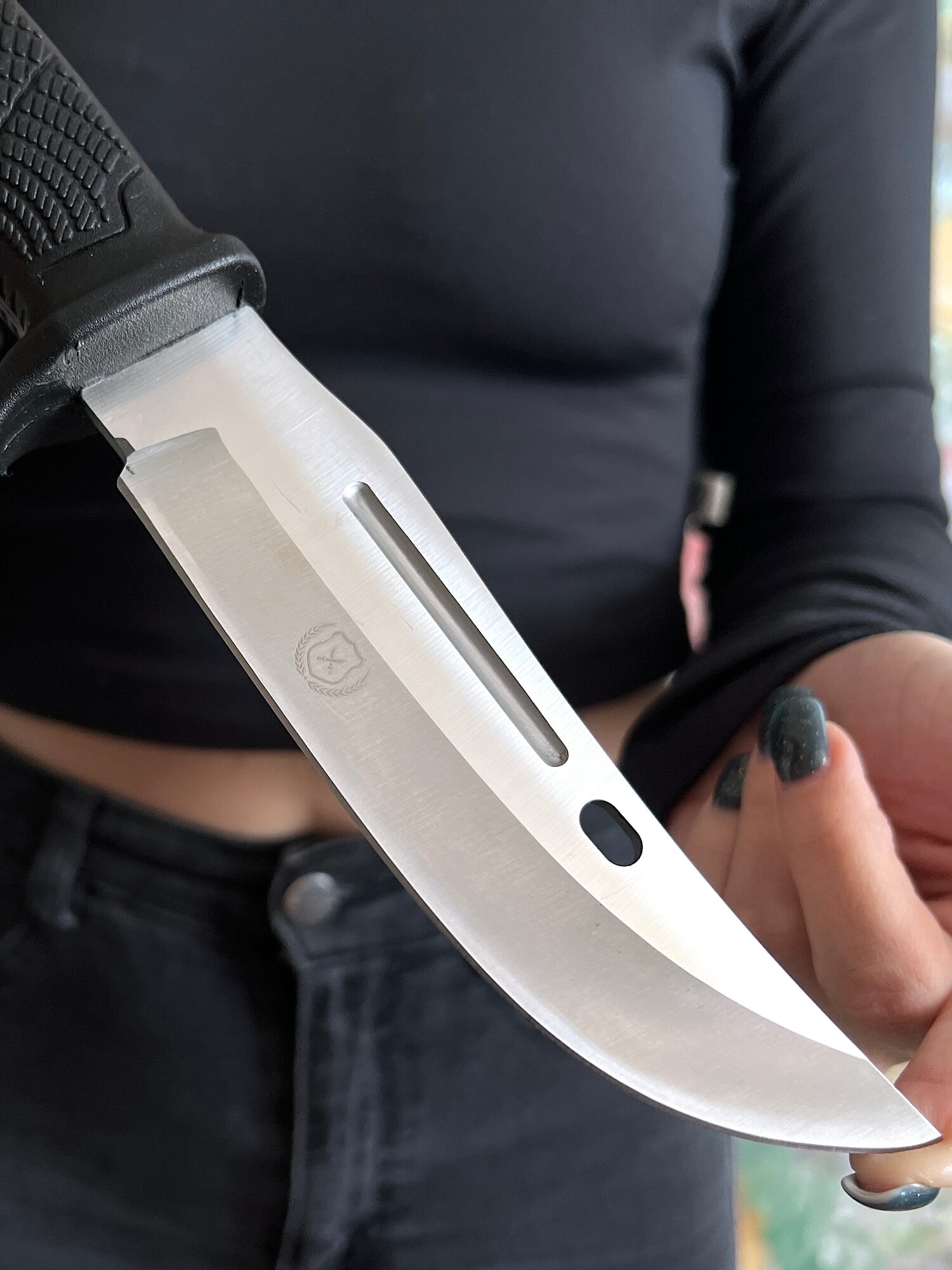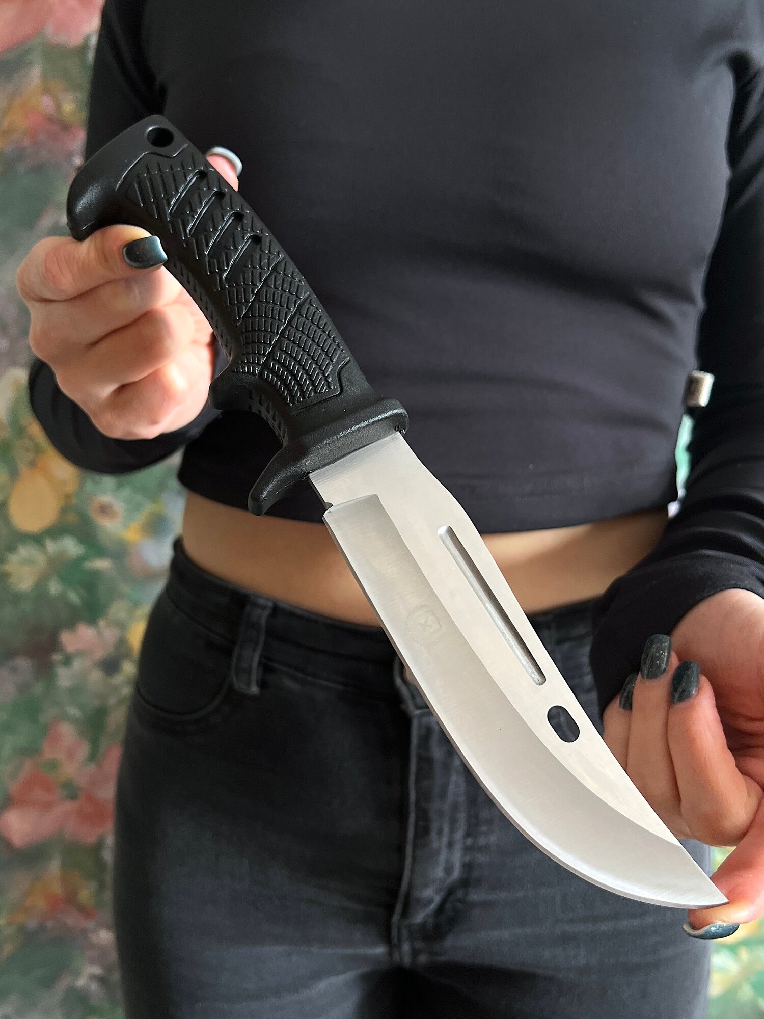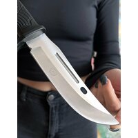 Удобная рукоять выполнена из ударопрочного ABS размером 12,5 см крепко фиксируется в руке, не выскальзывает при работе даже в экстремальных условиях: в дождь, снег, жару или холод. Идеально сбалансированный вес ножа 177 гр. способствует удобной работе: приготовление пищи, разделки дичи, забоя КРС и тд.