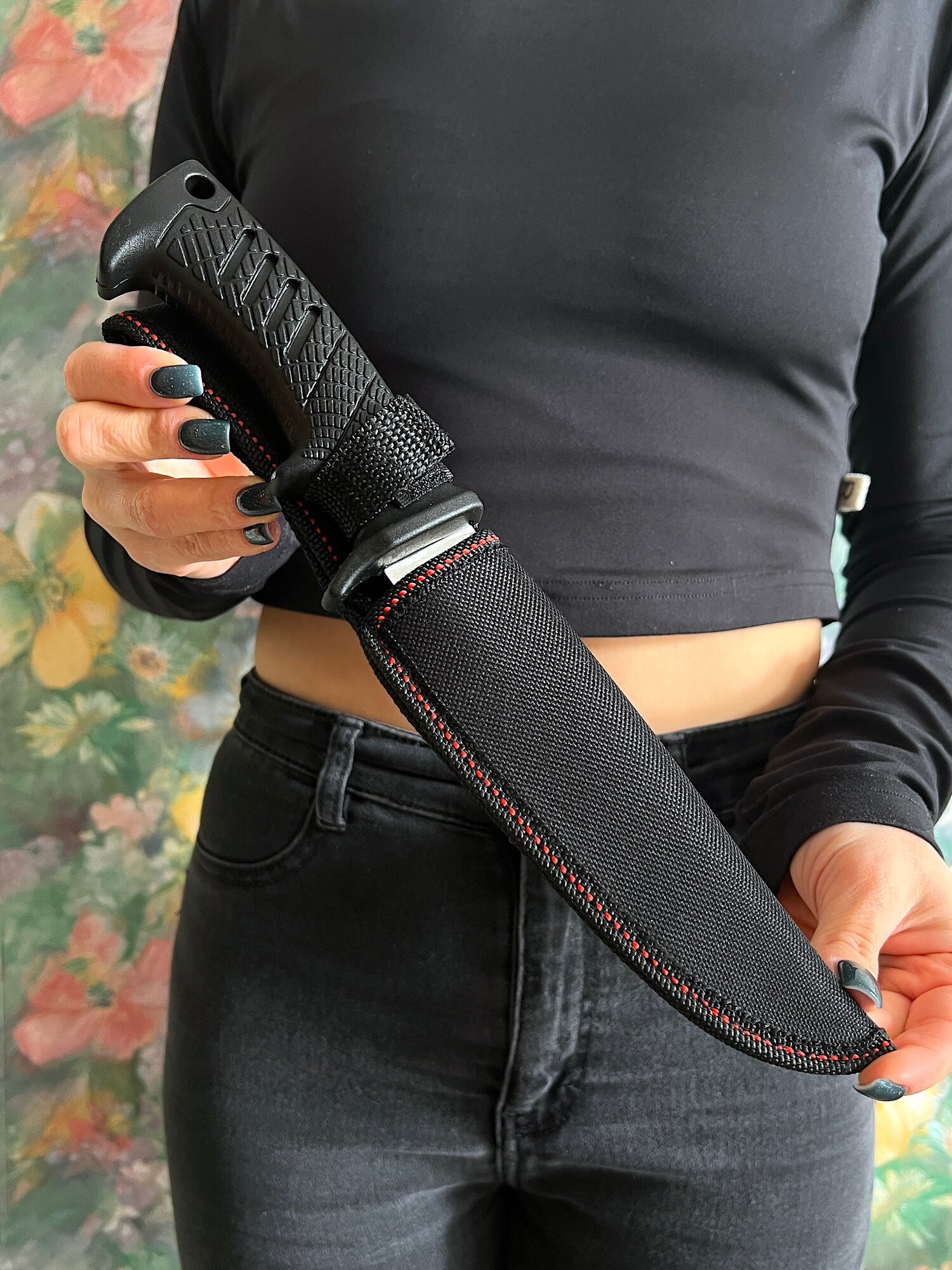 В комплект входит прочный, влагостойкий чехол, который защищает лезвие от повреждений. Для удобства есть возможность закрепить ножны на пояс с помощью петли.