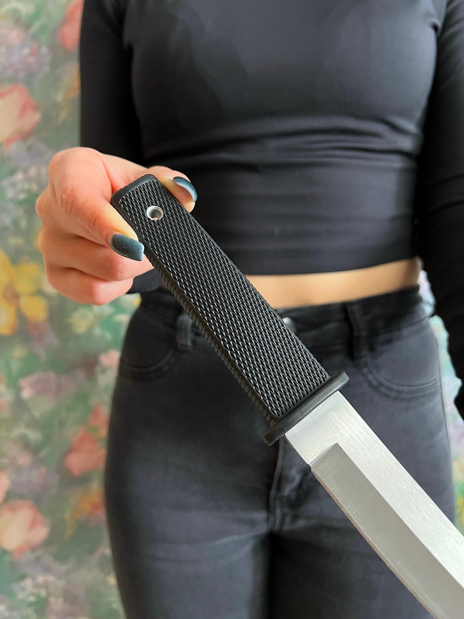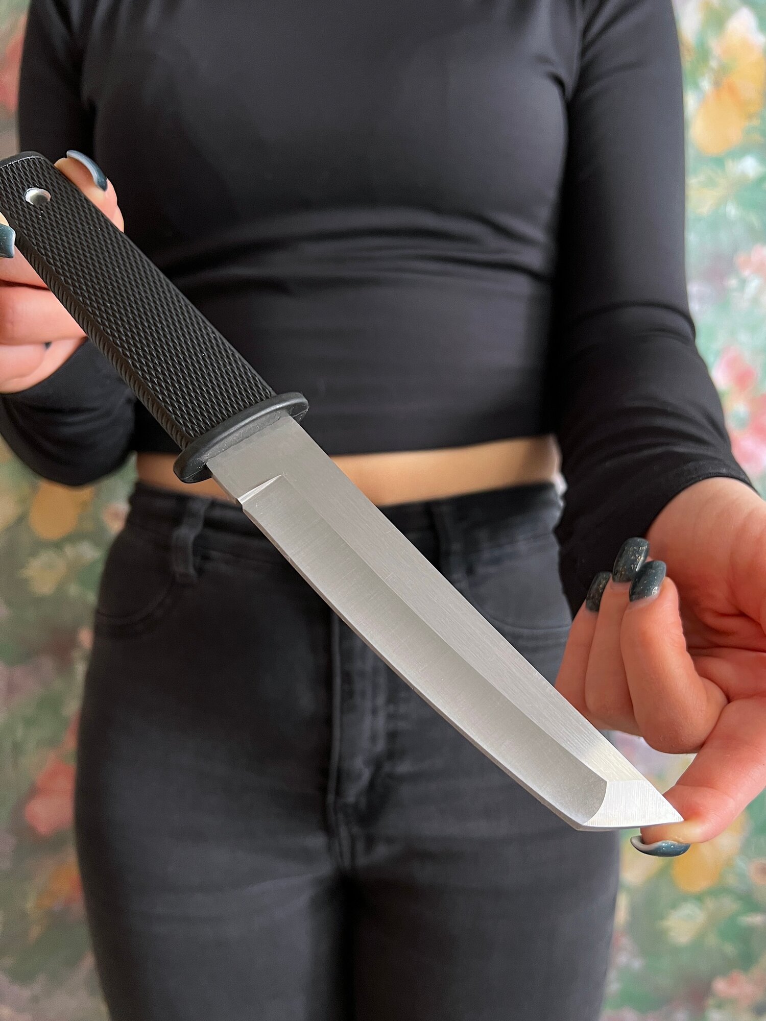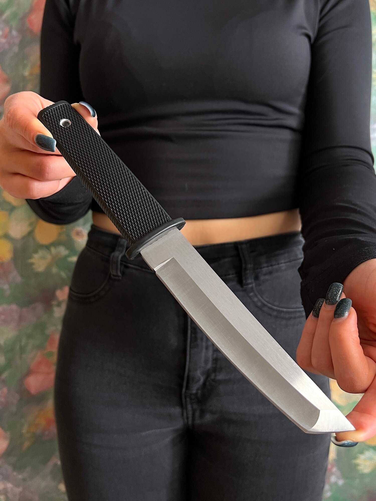 Удобная, прорезиненная рукоять размером 11 см крепко фиксируется в руке, не выскальзывает при работе даже в экстремальных условиях: в дождь, снег, жару или холод. Идеально сбалансированный вес ножа 140 гр. способствует удобной работе: приготовление пищи, разделки дичи, забоя КРС и тд.