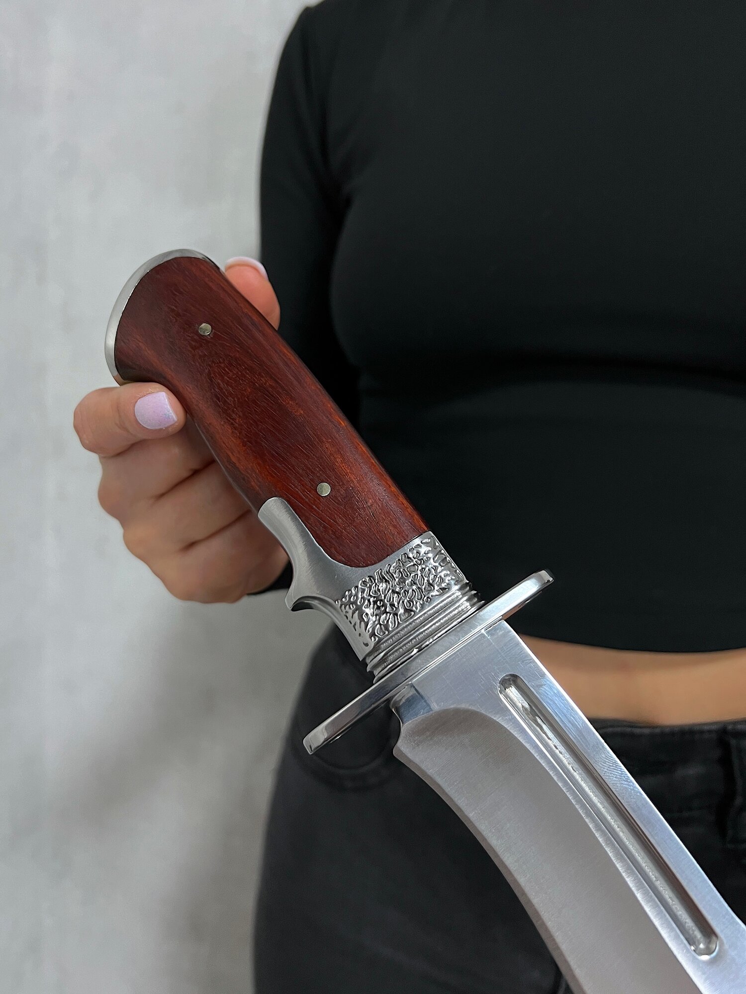Удобная, деревянная рукоять размером 13 см крепко фиксируется в руке, не выскальзывает при работе даже в экстремальных условиях: в дождь, снег, жару или холод. Идеально сбалансированный вес ножа 335 гр. способствует удобной работе: приготовление пищи, разделки дичи, забоя КРС и тд.