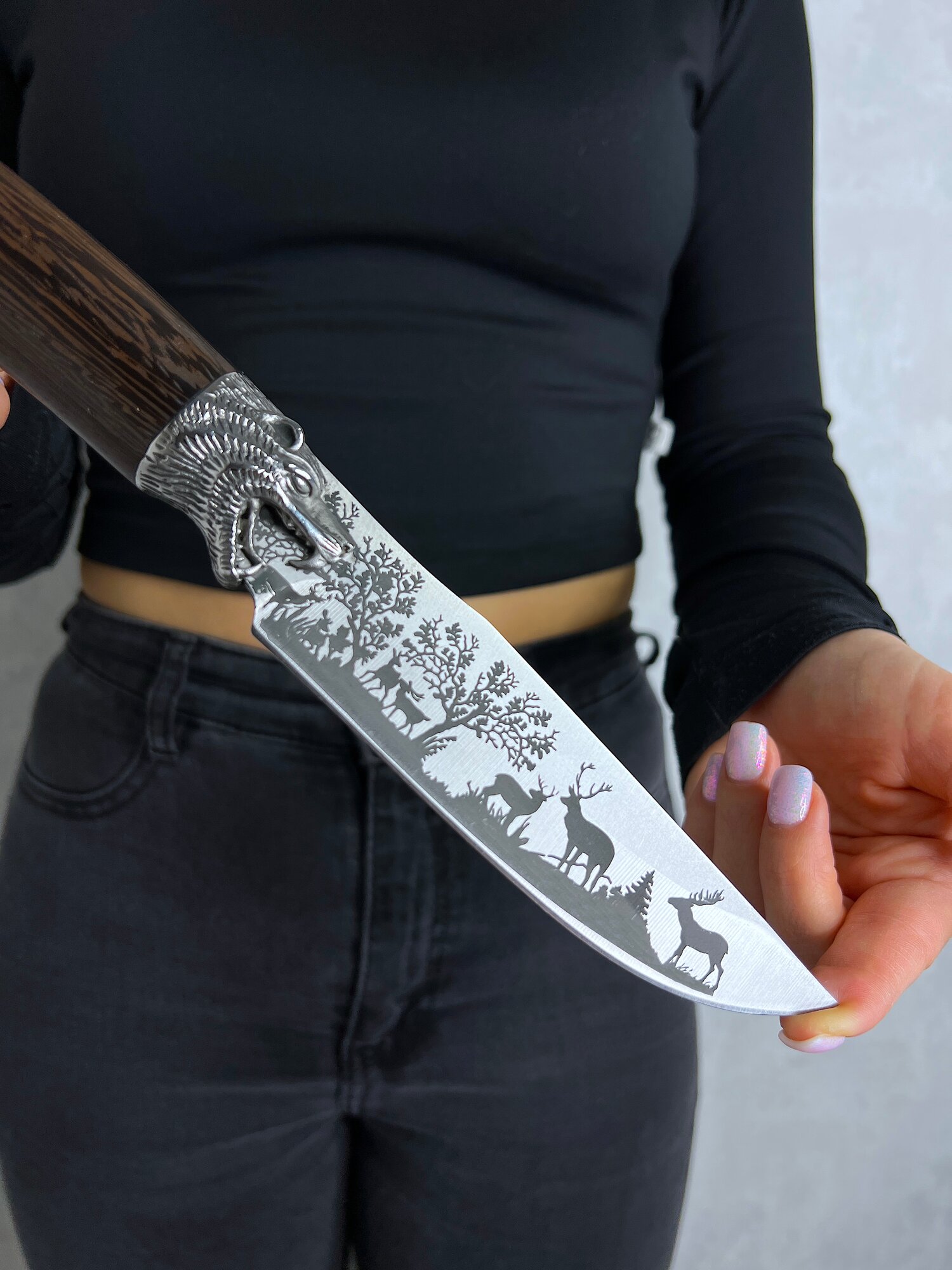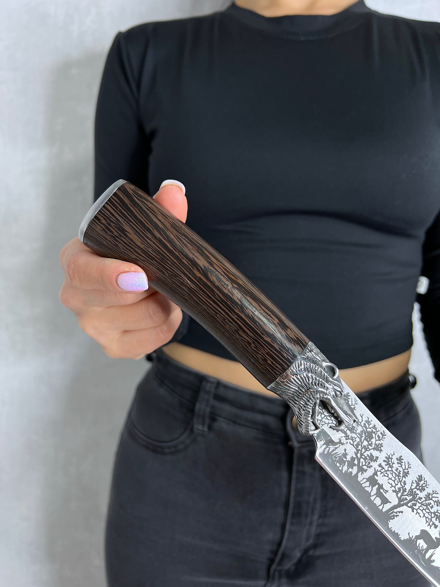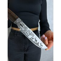 Удобная, деревянная рукоять размером 13,5 см крепко фиксируется в руке, не выскальзывает при работе даже в экстремальных условиях: в дождь, снег, жару или холод. Идеально сбалансированный вес ножа 225 гр. способствует удобной работе: приготовление пищи, разделки дичи, забоя КРС и тд.