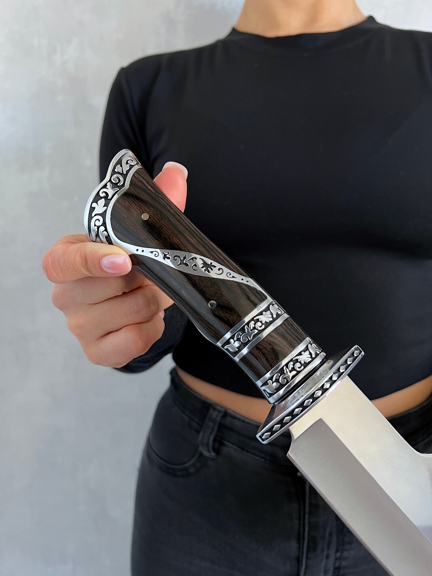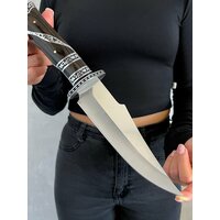 Удобная, деревянная рукоять размером 14 см крепко фиксируется в руке, не выскальзывает при работе даже в экстремальных условиях: в дождь, снег, жару или холод. Идеально сбалансированный вес ножа 330 гр. способствует удобной работе: приготовление пищи, разделки дичи, забоя КРС и тд.