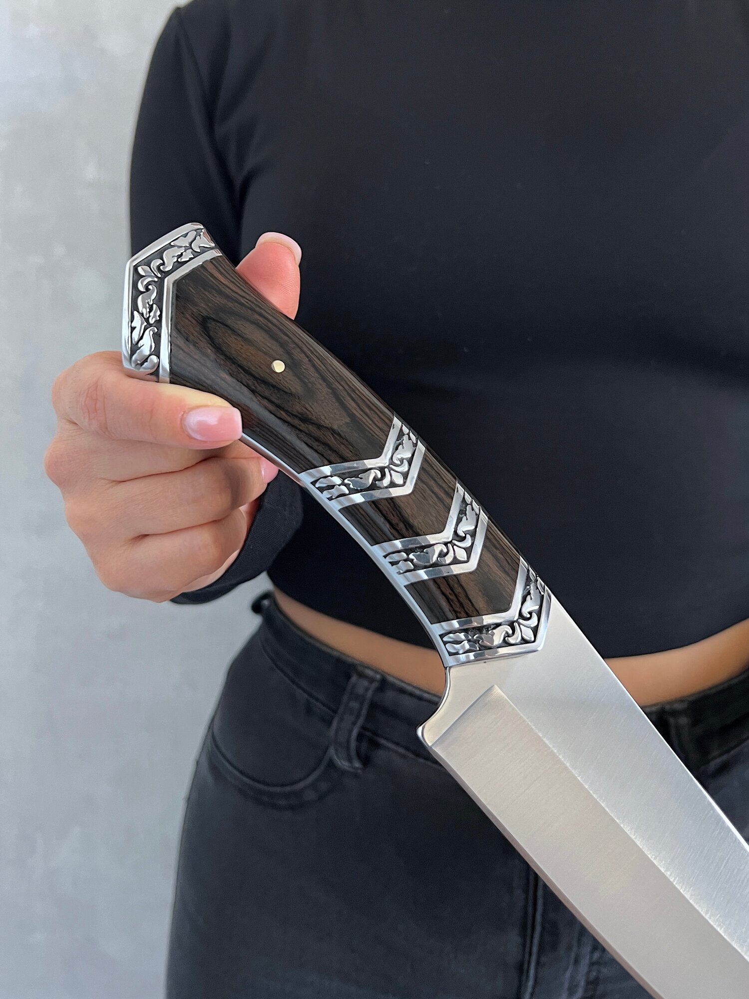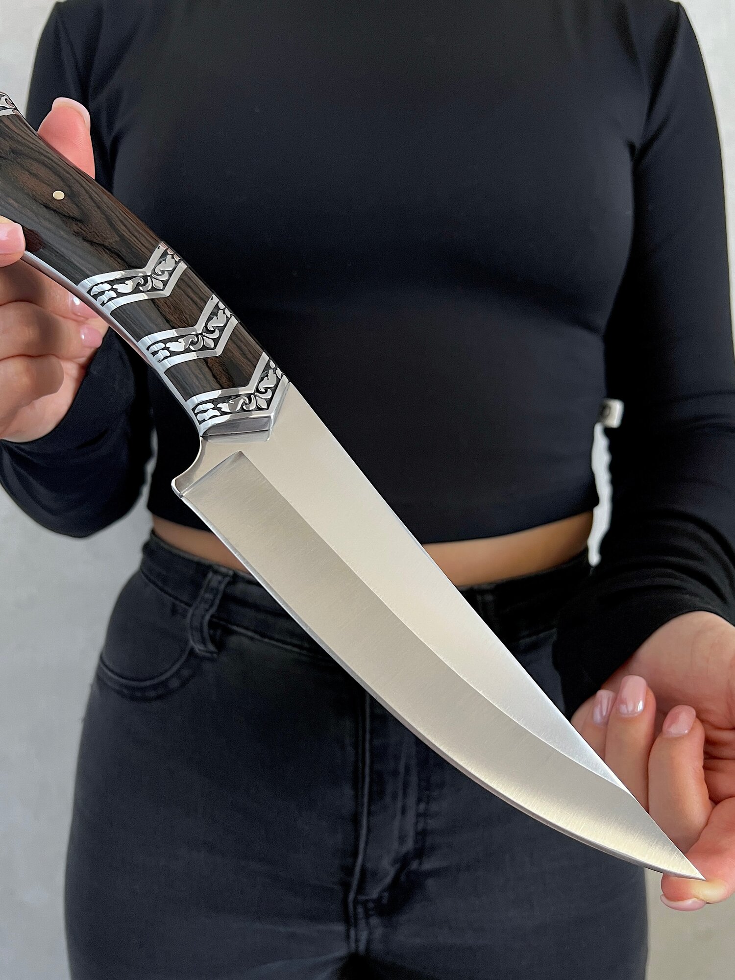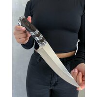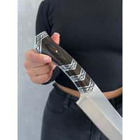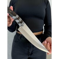 Удобная, деревянная рукоять размером 13 см крепко фиксируется в руке, не выскальзывает при работе даже в экстремальных условиях: в дождь, снег, жару или холод. Идеально сбалансированный вес ножа 308 гр. способствует удобной работе: приготовление пищи, разделки дичи, забоя КРС и тд.