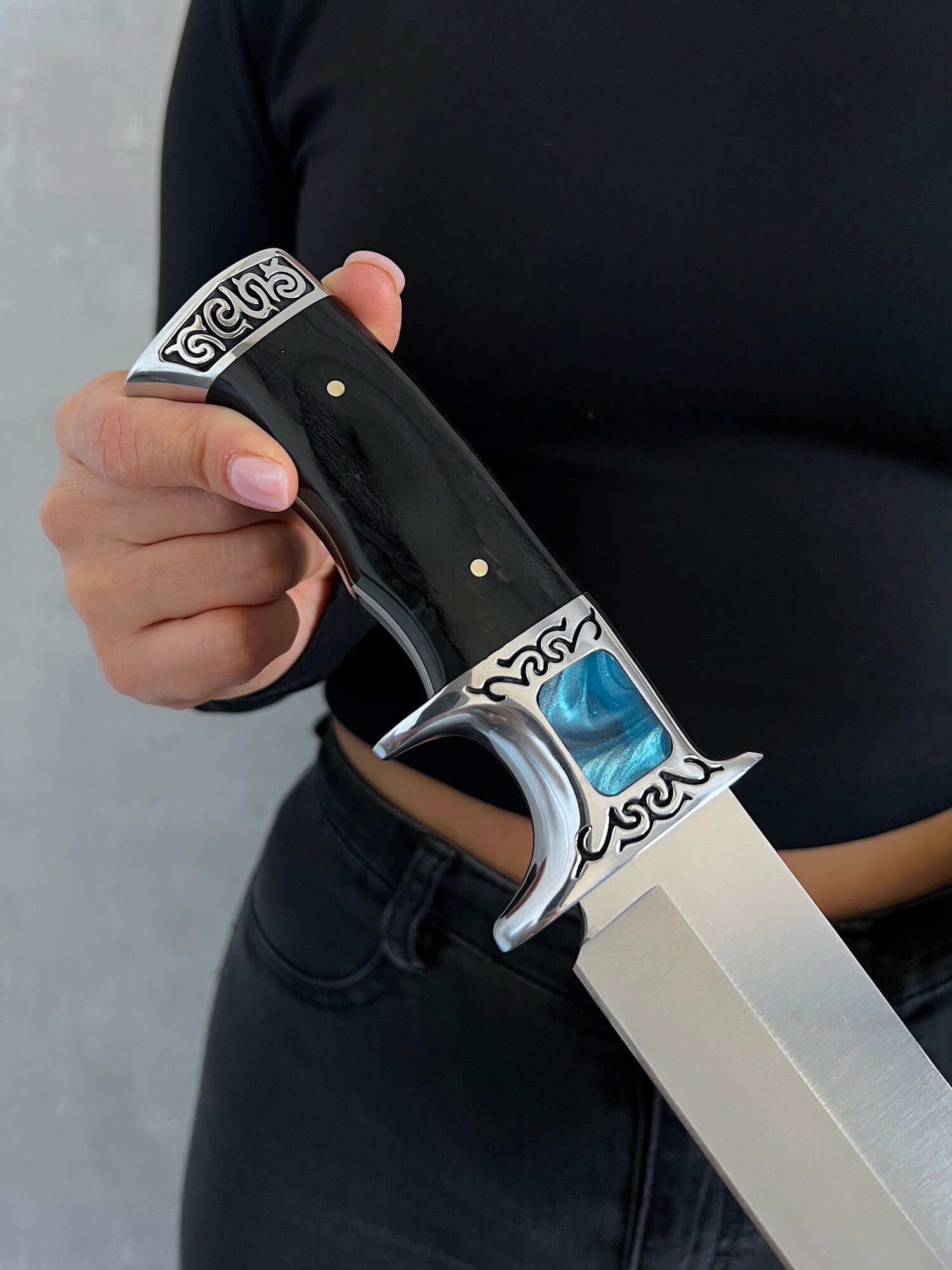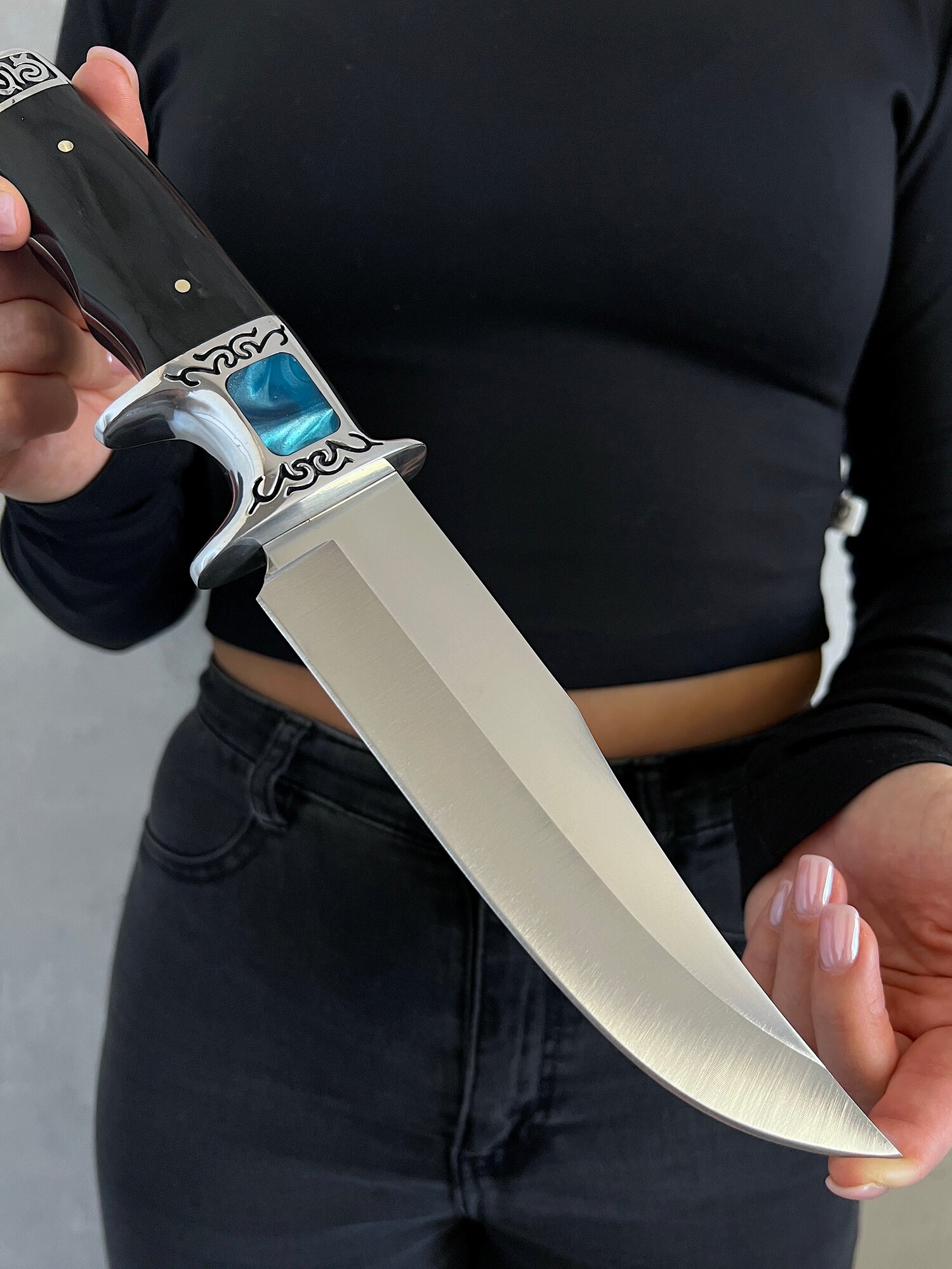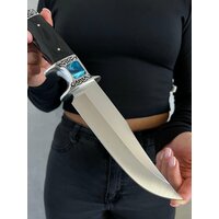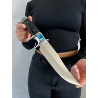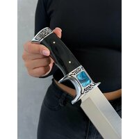 Удобная, деревянная рукоять размером 12,5 см крепко фиксируется в руке, не выскальзывает при работе даже в экстремальных условиях: в дождь, снег, жару или холод. Идеально сбалансированный вес ножа 325 гр. способствует удобной работе: приготовление пищи, разделки дичи, забоя КРС и тд.