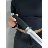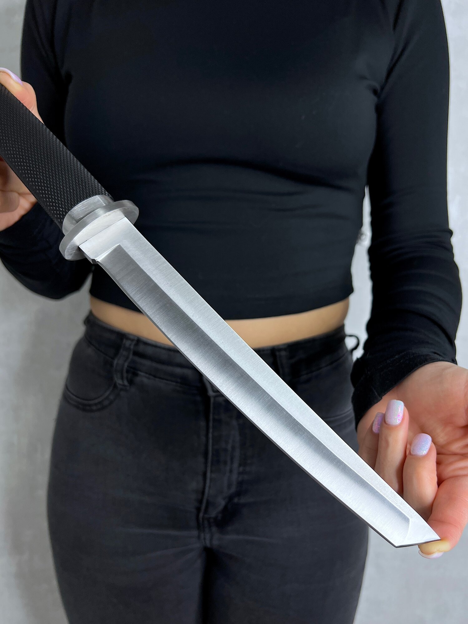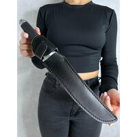 Удобная, прорезиненная рукоять размером 13,5 см крепко фиксируется в руке, не выскальзывает при работе даже в экстремальных условиях: в дождь, снег, жару или холод. Идеально сбалансированный вес ножа 420 гр. способствует удобной работе: приготовление пищи, разделки дичи, забоя КРС и тд.
