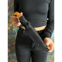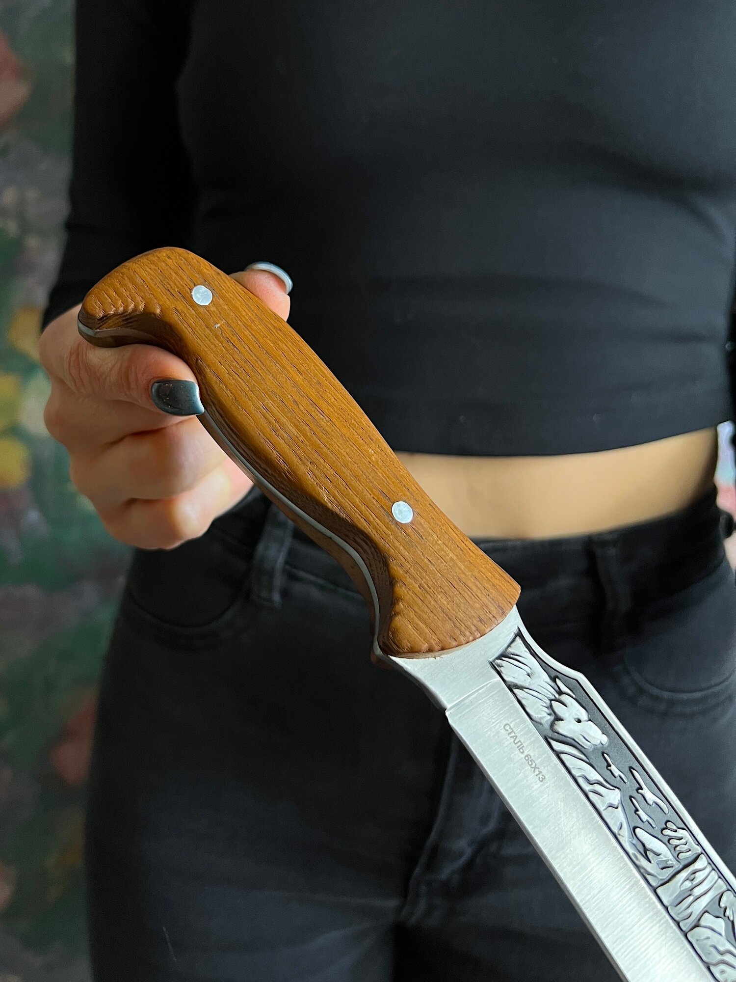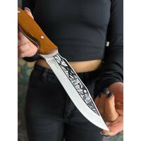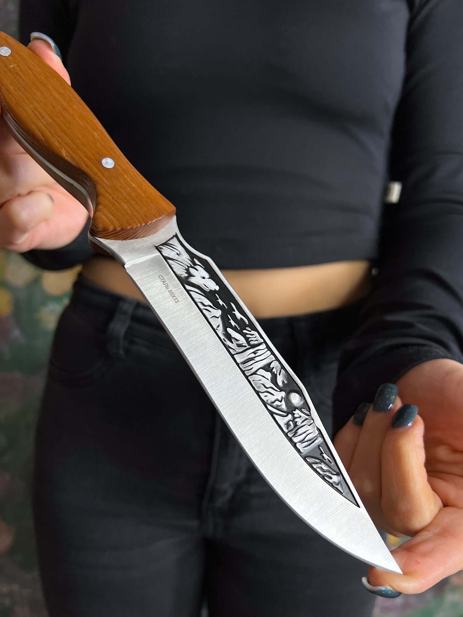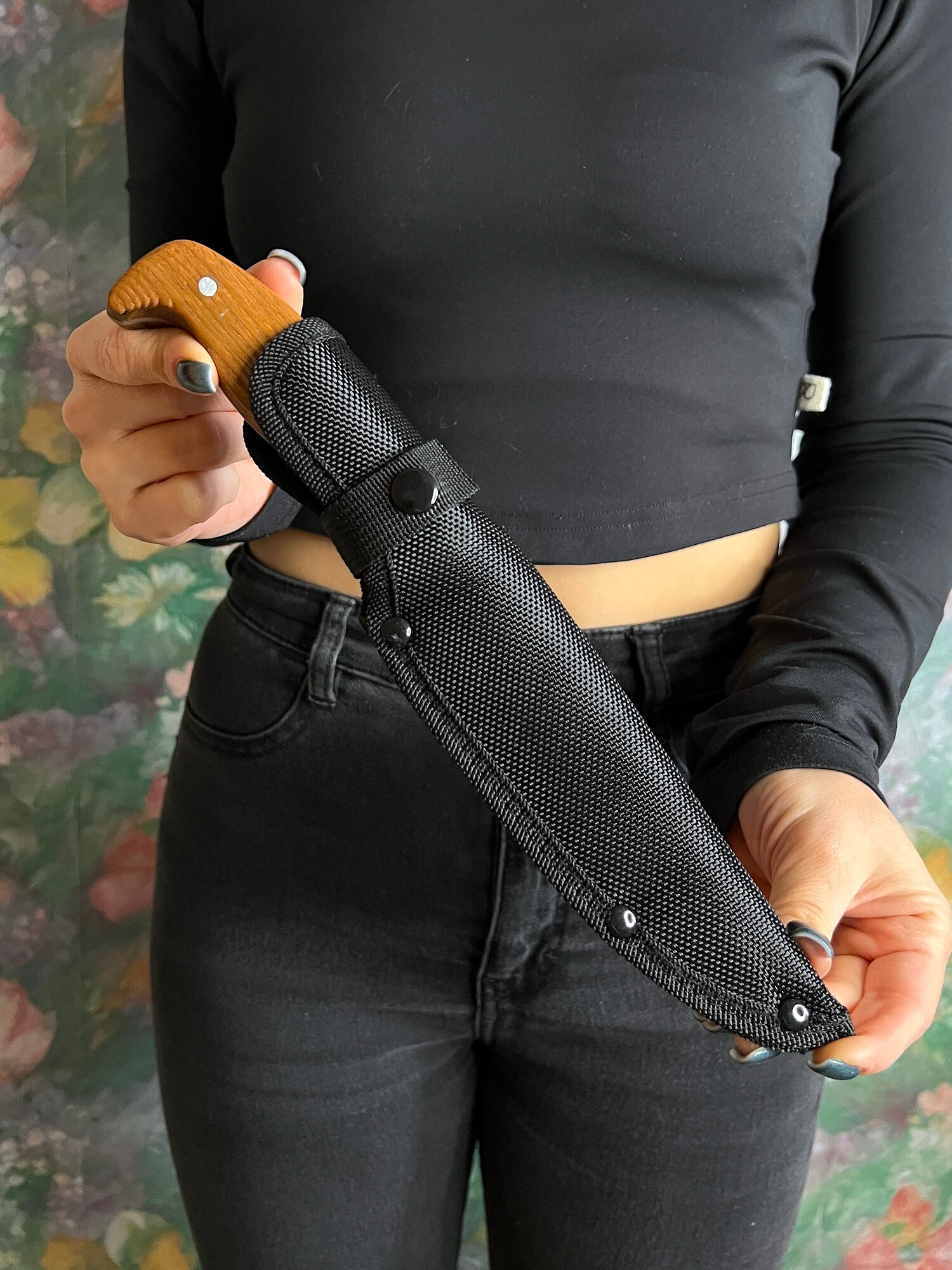 Удобная, деревянная рукоять размером 11 см крепко фиксируется в руке, не выскальзывает при работе даже в экстремальных условиях: в дождь, снег, жару или холод. Идеально сбалансированный вес ножа 165 гр. способствует удобной работе: приготовление пищи, разделки дичи, забоя КРС и тд.