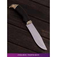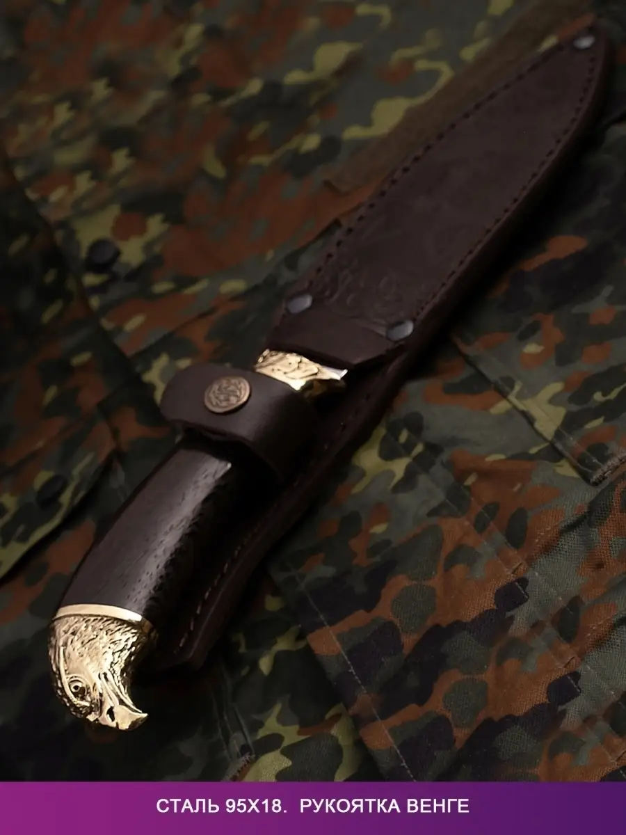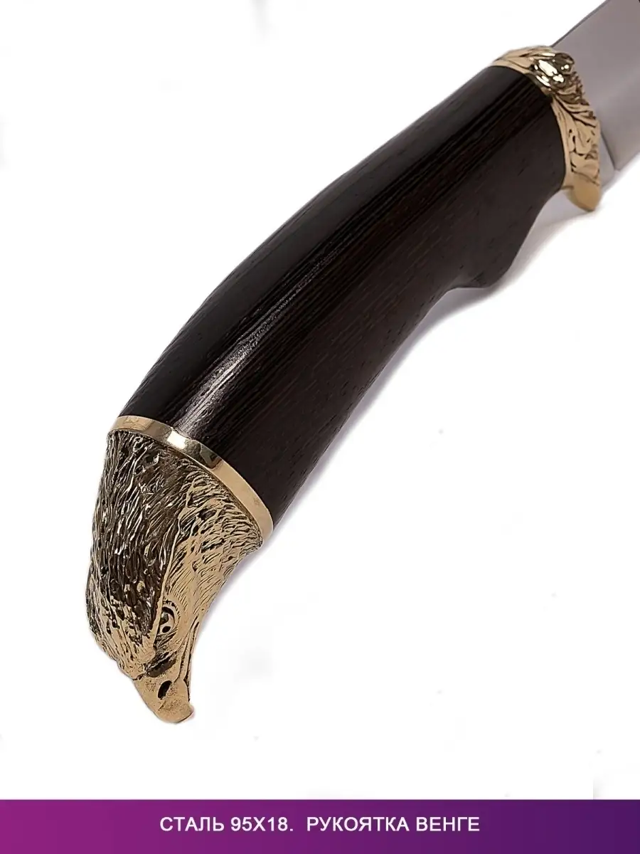 Охотничий нож из кованной стали 95х18 ручной работы. Каждый нож изготавливается вручную. Из-за этого длина и толщина клинка и рукоятки у каждого ножа могут отличаться на несколько миллиметров от заявленных в описании. Основные характеристики ножа: - Длина клинка: 135 мм. - Материал рукоятки: Венге/Латунь художественное литье. - Длина рукоятки : 125 мм. - Толщина обуха:3.1 - 3.5 мм. - Ширина клинка: 34 мм. - Твердость стали: 59 HRC. - Комплектация: Нож, кожаные ножны, картонная коробка. Сталь 95х18 идеально подходит для охоты, рыбалки, туризма и ошкуривания дичи. Сталь 95х18 не боится влаги. Долго держит заточку. В комплекте идут кожаные ножны с рисунком. Ножны фиксируются на свободном подвесе на ремень. Кованая сталь 95х18 относится к категории мягких сталей, считается одним из лучших материалов для изготовления ножей. Заходите в наш магазин на Яндекс Маркет (нужно кликнуть на картинку бренда), чтобы ознакомиться с остальным ассортиментом нашего бренда.
