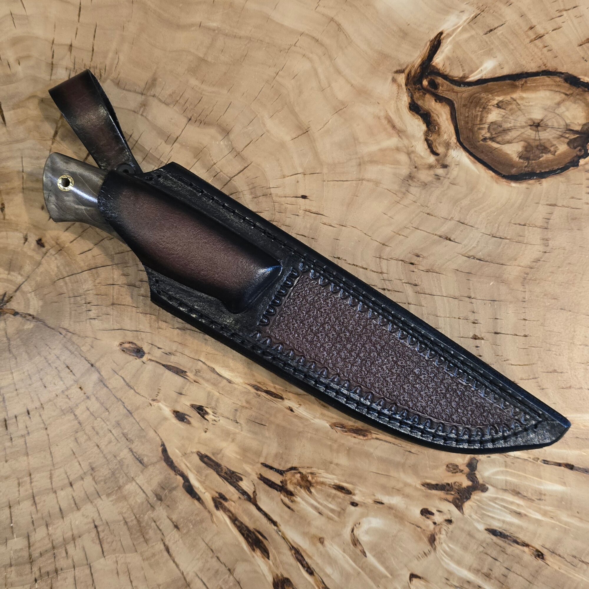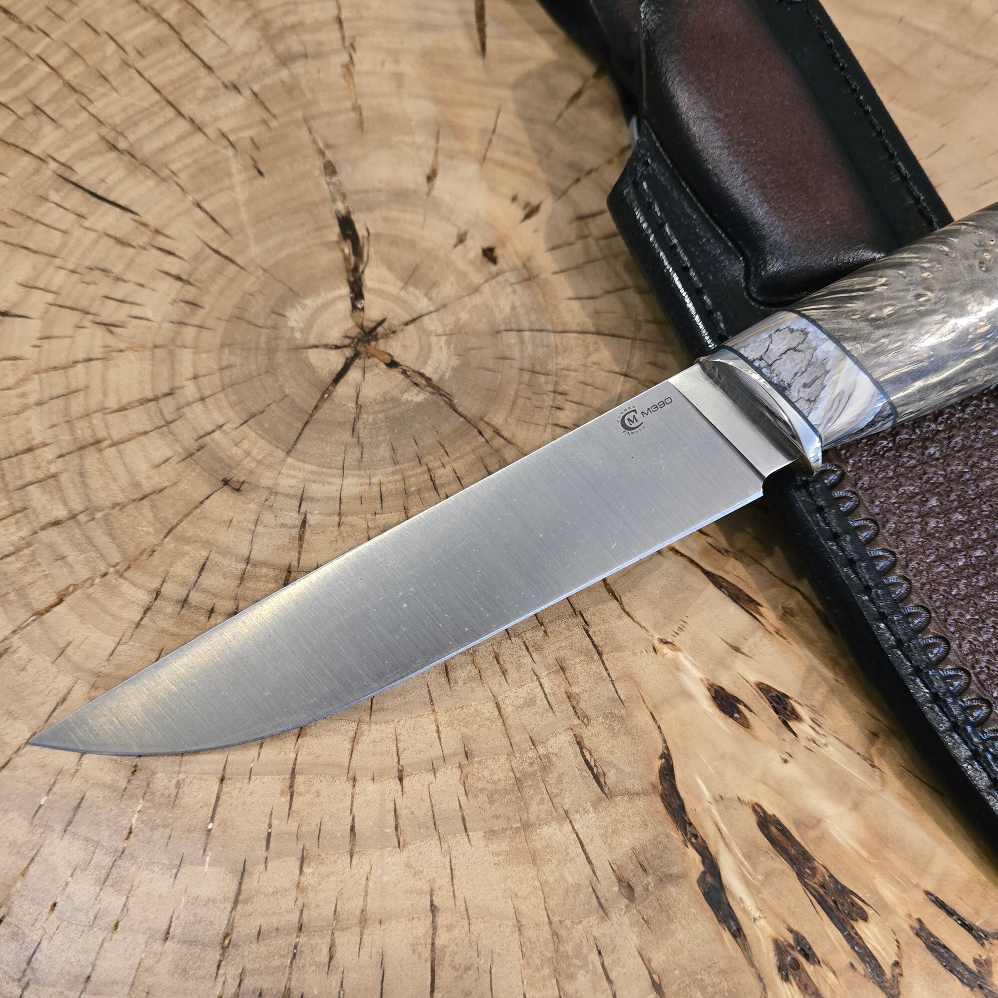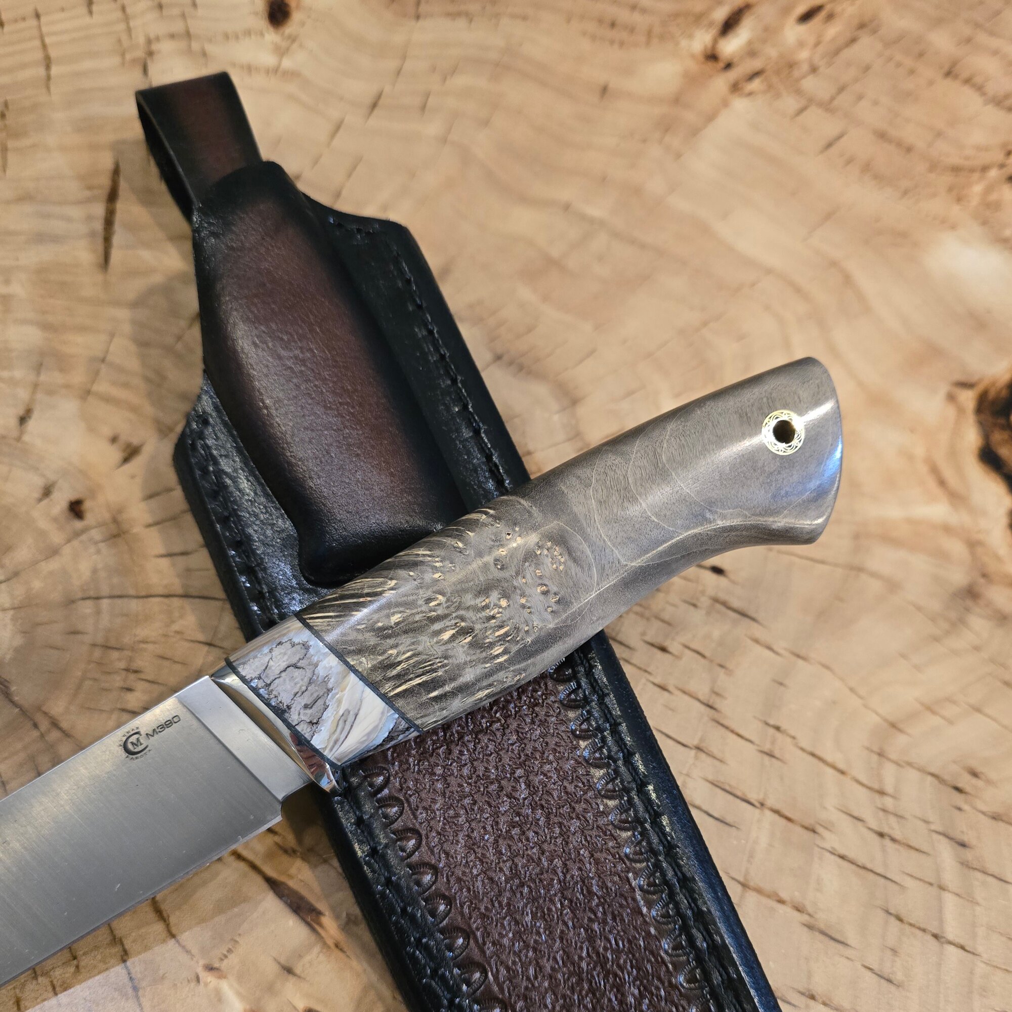 Купить Нож Пантера с формованными ножнами, сталь M390, рукоять кап клена, вставка стабилизированный зуб мамонта, Мастерская Семина с доставкой по всей России.