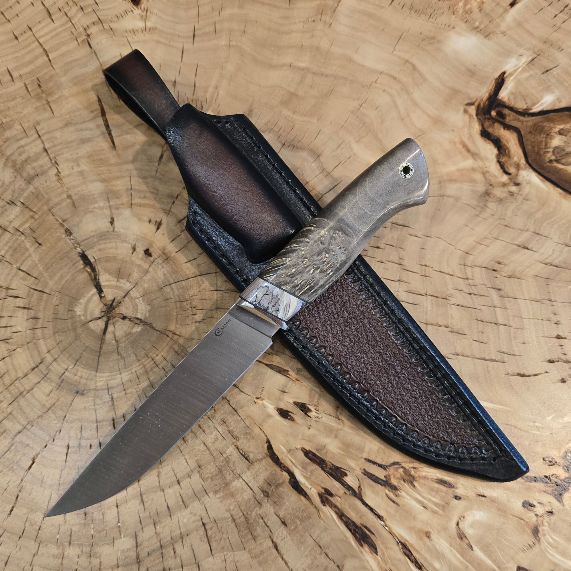 Нож Пантера с формованными ножнами, сталь M390, рукоять кап клена, вставка стабилизированный зуб мамонта, Мастерская Семина: сравнение цен, характеристики, фото, актуальное наличие и цены.