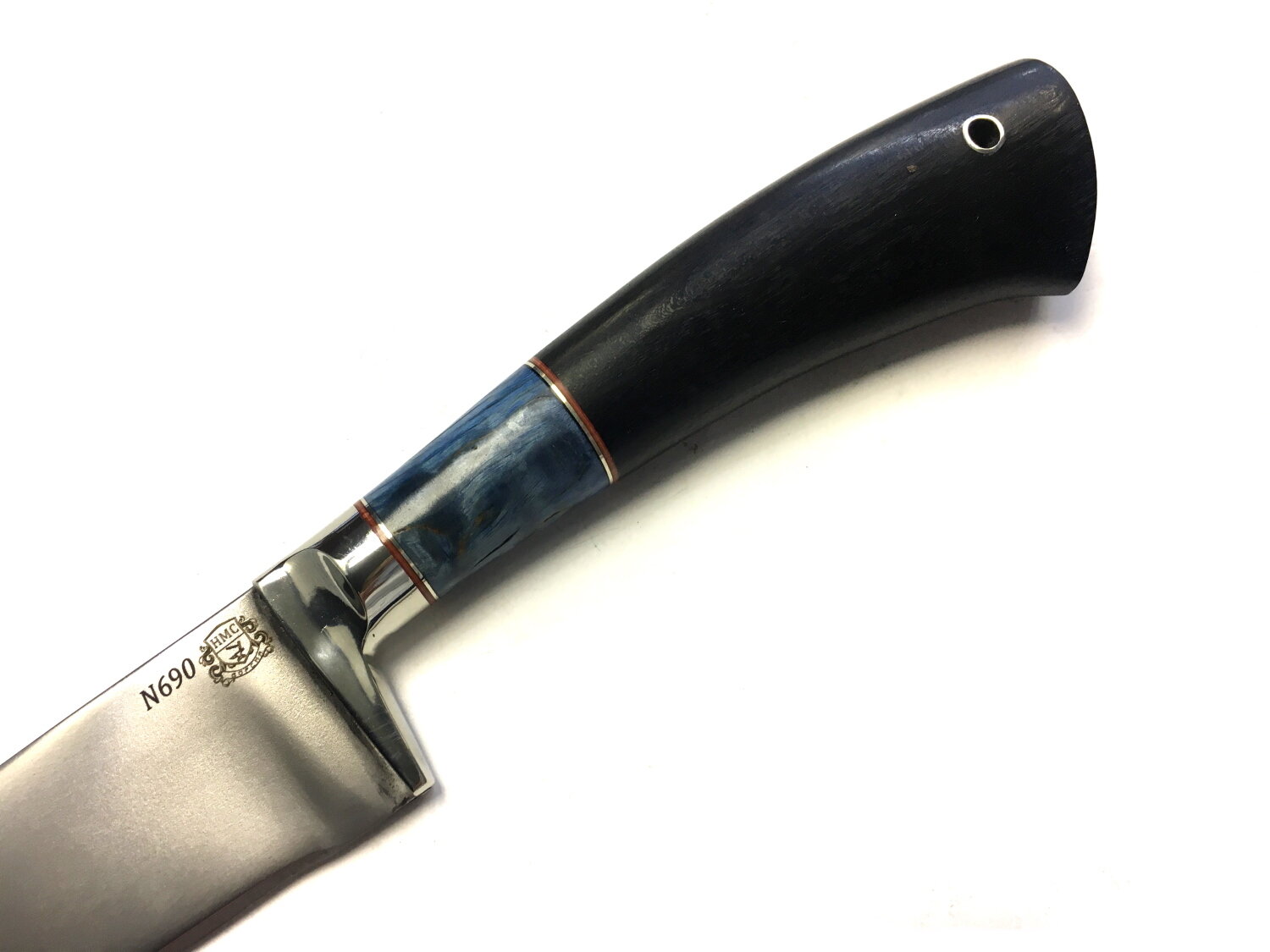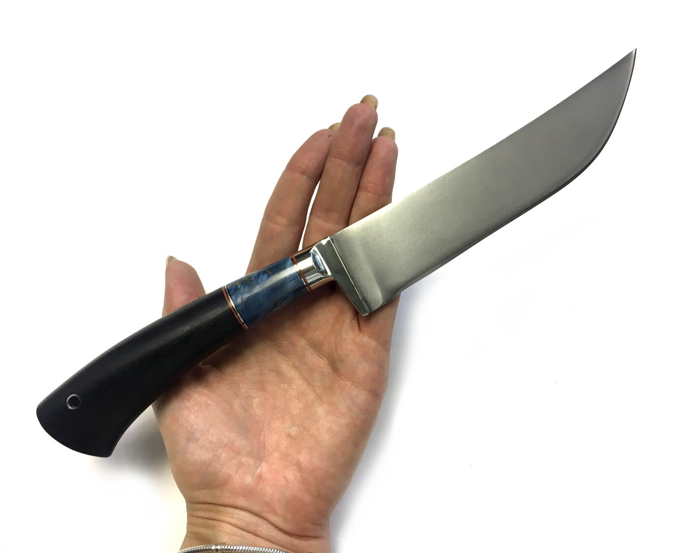Нож Узбекский - выполнен в презентабельном варианте, идеален для подарка мужчине. Качественный и функциональный клинок изготовлен из стабилизированной карельской березы, черного граба с литьем латунь, который в то же время эстетично выглядит и выполнен с душой. Пчак вам непременно понравится, поэтому не откладывайте покупку на потом, успейте заказать нож из порошковой стали Bohler N690. Сталь: Bohler N690 Рукоять: стабилизированная карельская береза, черный граб, мельхиор Общая длина, мм 290 Длина клинка, мм 150 Ширина клинка, мм 34 Толщина клинка, мм 4,0 Твёрдость клинка, HRC 62