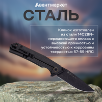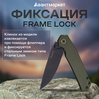 Нож оснащен двумя элементами раскрытия – шпенек и флиппер. С одной стороны нож раскрывается от нажатия большим пальцем на шпенек и последующего взмаха рукой. Другой способ нацелен на срабатывание полуавтоматического механизма при нажатии указательным пальцем на выступающий плавник. Замок Frame Lock прост в использовании и надежно защищает от случайного раскрытия. Подшипник обеспечивает клинку плавный ход и исключают преждевременное появление люфтов.