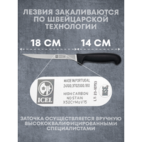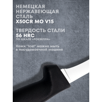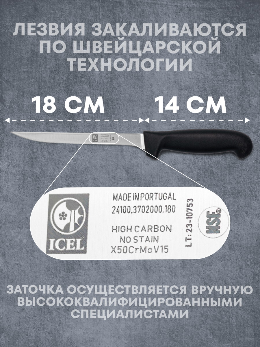 Особое внимание стоит уделить технологии закалки, применяемой для лезвий ножей Icel, которая осуществляется по швейцарской технологии. Это позволяет добиться твердости в пределах 54–56 единиц по шкале Роквелла, что гарантирует способность держать остроту в течение длительного времени и повышает долговечность лезвий. Профессиональная заточка, проводимая вручную опытными мастерами, обеспечивает точность реза и легкость в работе с продуктами.