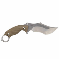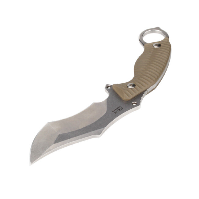 Рукоять изготовлена из стеклотекстолита G10, который представляет собой смесь стеклоткани и эпоксидных смол. Это достаточно прочный и стойкий к повреждениям материал, хорошо переносит влагу, отлично поддаётся окрашиванию. К тому же, G10 устойчив к воздействиям высоких температур. Рукоять с таким материалом в составе будет иметь долгий срок службы и хорошо противостоять влиянию различных факторов.