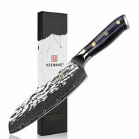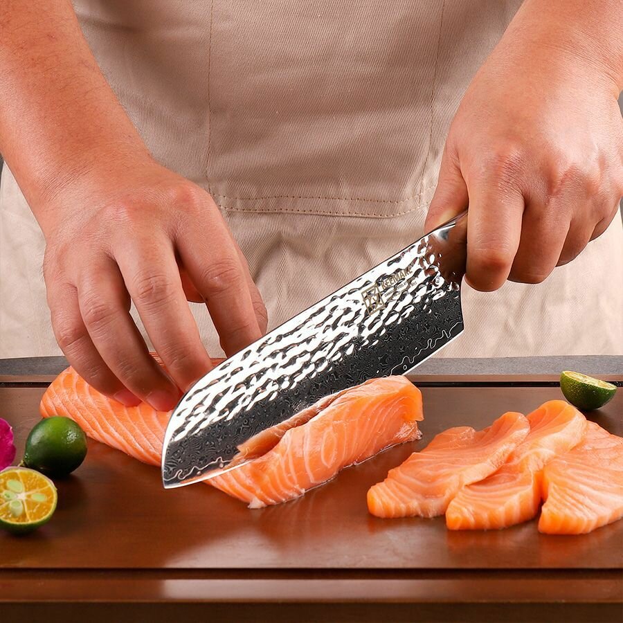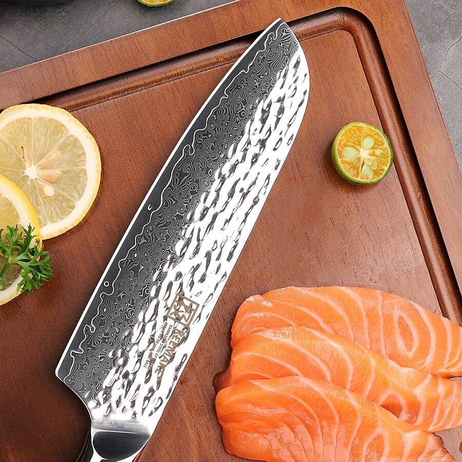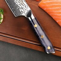 Профессиональный кухонный нож Сантоку CJ-6 от компании Keemake, представляющий серию Blue Gem, выполнен по старинной дамасской технологии и имеет сердечник из высокоуглеродистой стали V Gold-10, благодаря чему ножи кухонные CJ-6 имеют высокую твердость в 60 HRC по шкале Роквелла. Серия Blue Gem объединяет элегантный и лаконичный дизайн с великолепными рабочими характеристиками. Нож из дамасской стали Сантоку создан для быстрой и легкой нарезки разнообразных овощей, зелени, мяса и других гастрономических продуктов. Особенностью, которую имеют ножи кухонные профессиональные Сантоку от Keemake, является широкий клинок длиной 173 мм, который имеет сверхострую режущую кромку и идеально сбалансированный вес. Такая длина клинка позволяет уверенно использовать кухонные ножи для работы с широким спектром продуктов: от мелких овощей и листьев салата до тыквы и мясных филе. Более того, ножи для кухни также могут быть использованы в качестве лопатки для перемещения нарезанных ингредиентов с разделочной доски в миску или кастрюлю. Универсальный Сантоку нож заслуженно считается многозадачным, он подходит для нарезки мяса, овощей, зелени, грибов и многих других продуктов. Несмотря на внушительные размеры, кухонные принадлежности Keemake легко использовать в самых стесненных условиях. Ножи из дамасской стали позволяют применять различные техники нарезки, включая вертикальную шинковку, а также методы с потягом к рукояти и от рукояти. А последний способ особенно популярен среди японских поваров, которые часто используют движения "от себя" для нарезки. Если вы не хотите приобретать множество различных ножей для разных задач, нож кухонный профессиональный Сантоку серии Blue Gem станет идеальным выбором для вас, справляясь с любой кулинарной задачей. Сердечник, который имеют товары для кухни VG-10, покрыт 67 слоями дамасской стали, обогащенной кобальтом, ванадием и другими элементами. Такая многослойность делает ножи столовые Keemake обладателями уникального рисунка на боковых гранях клинка, который привлекает внимание своим эффектным видом. В процессе изготовления необычные ножи проходят вакуумную термическую обработку с последующим отпуском, что улучшает не только твердость, но и вязкость, а также другие характеристики клинка. Этот нож для мяса и овощей острый и обладает отлично заточенной режущей кромкой, симметричной и обработанной на водных камнях с высокой степенью зернистости под минимальным углом с обеих сторон. Такой нож поварской CJ-6 не требует частой заточки и долго сохраняет свою остроту, обеспечивая идеальный и лёгкий рез. Нож поварской профессиональный Сантоку получил эргономичную рукоять овальной формы, которая идеально ложится в руку, обеспечивая полный контроль над процессом резки. Она выполнена из качественной эпоксидной смолы, отполированной до зеркального блеска, напоминающего драгоценный камень. Изумрудный оттенок с глубиной перелива дополняет характерный стиль, который имеет шеф нож поварской Сантоку из дамасской стали, создавая иллюзию мягкого переката волн и миниатюрных песчинок, уносимых ветром. Материал рукояти гипоаллергенен, очень тверд, что делает её устойчивой к сколам, трещинам и интенсивному использованию. Нож для нарезки овощей и мяса легко чистится и сохраняет гладкую поверхность. Украшение в виде мозаичного пина из каче