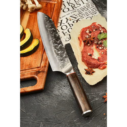 Купить Нож Сантоку кованый в подарочной упаковке для нарезки мяса, рыбы, овощей и фруктов, длина лезвия — 18см, нержавеющая сталь, JD-Tec DMS-428B с доставкой по всей России.