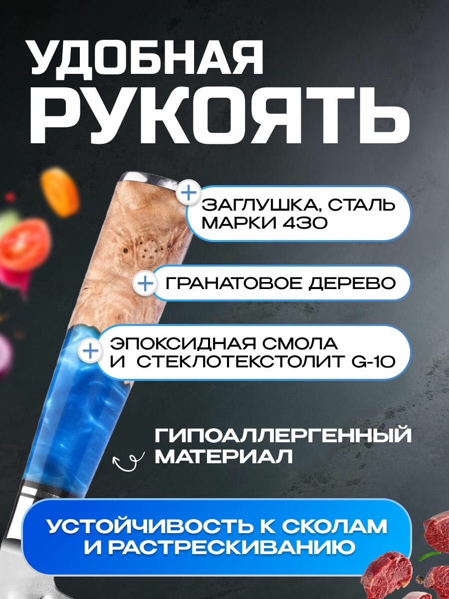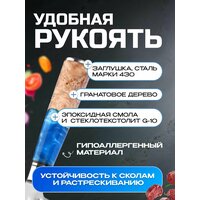 Эргономичная рукоять овального сечения комфортно ложится в руку и даёт полный контроль над процессом реза. Рукоять ножа Keemake серии Blue Sky выполнена из гранатового дерева, которое отличается глубоким, насыщенным цветом и уникальным рисунком волокон, что прекрасно сочетается с характерным стилем клинка из дамасской стали. Материал является гипоаллергенным и очень твердым, что делает рукоятку устойчивой к сколам, растрескиванию и интенсивному использованию. Рукоятка ножа Keemake легко чистится и сохраняет гладкую поверхность.