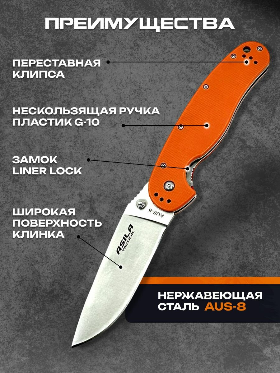 Клипса имеет четыре точки крепления. Этот туристический нож обязательно имеет отверстие под темляк. Предусмотрен для левши. Удобный в обхвате. Очень крепкий. Четырех позиционная клипса. Насечки на обухе. Низко посаженная клипса. Использование стали с высочайшим уровнем термообработки - другие ножи из этой же стали не могут сравниться с RAT-1. Это выбор большинства среди тех, кто предпочитает качественные ножи. Открывание одной рукой очень плавное и лёгкое, быстрое и четкое.