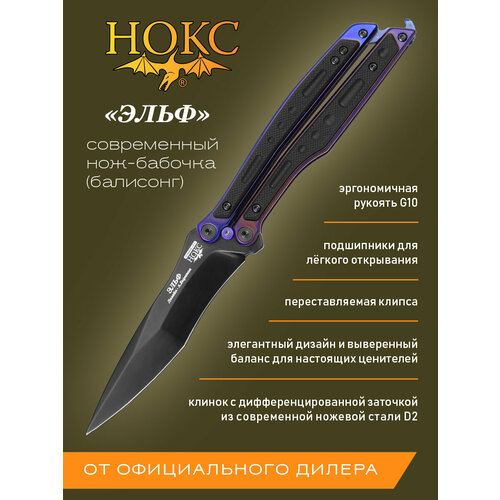 «Эльф» - это традиционный балисонг («бабочка»), но дизайн и конструкция самые современные. Сатинированный клинок типа «spear-point» выполнен из прекрасно удерживающей остроту легированной стали D2 и имеет оригинальный строй с двумя рабочими участками. А попарно соединённые стальные плашки с накладками из стойкого композита G10 одним лёгким движением либо прячут в себе клинок, либо мгновенно выпускают его, а сами образуют изящную рукоять с переставляемой клипсой, удобную и для правшей, и для левшей. «Эльф» соединяет в себе удобство ношения складного ножа с прочностью и надёжностью ножа с фиксированным клинком. Нож относится к серии «Т» - самой современной и технологичной серии компании. Отличный выбор и для себя, и для подарка. Дизайн - А. Бирюков.
