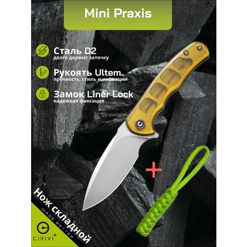 Mini Praxis — складной небольшой карманный EDC нож от компании CIVIVI. Относится к не особо дороким, околобюджетным ножам. Клинок ножа выполнен из стали D2. Раскрытие клинка плавное, из-за установленного керамического шарикоподшипника в механизме. Рукоять ножа стальная с накладкой из G10. Оснащён замком типа - Liner-Lock. Клипса типа Tip-Up из нержавеющей стали. Материал клинка D2 — это одна из самых популярных ножевых сталей в мире. Она содержит 12% хрома, что не позволяет называться нержавеющей, но все же она достаточно хорошо противодействует коррозии. Из положительных характеристик стоит так же отметить, что она хорошо держит режущую кромку острой и обладает неплохой ударной вязкостью. Рукоять выполнена из пластика Ultem - это специализированный термопластик, известный также как полиацеталь. Появившись благодаря разработке компании General Electric в 1990-х, к 2007 году торговая марка перешла в руки корпорации SABIC из Саудовской Аравии. Относясь к категории инженерных пластиков, Ultem славится своими эксклюзивными свойствами, делающими его востребованным в множестве сфер. Ultem в ножевой индустрии - прочность, стиль и инновации.