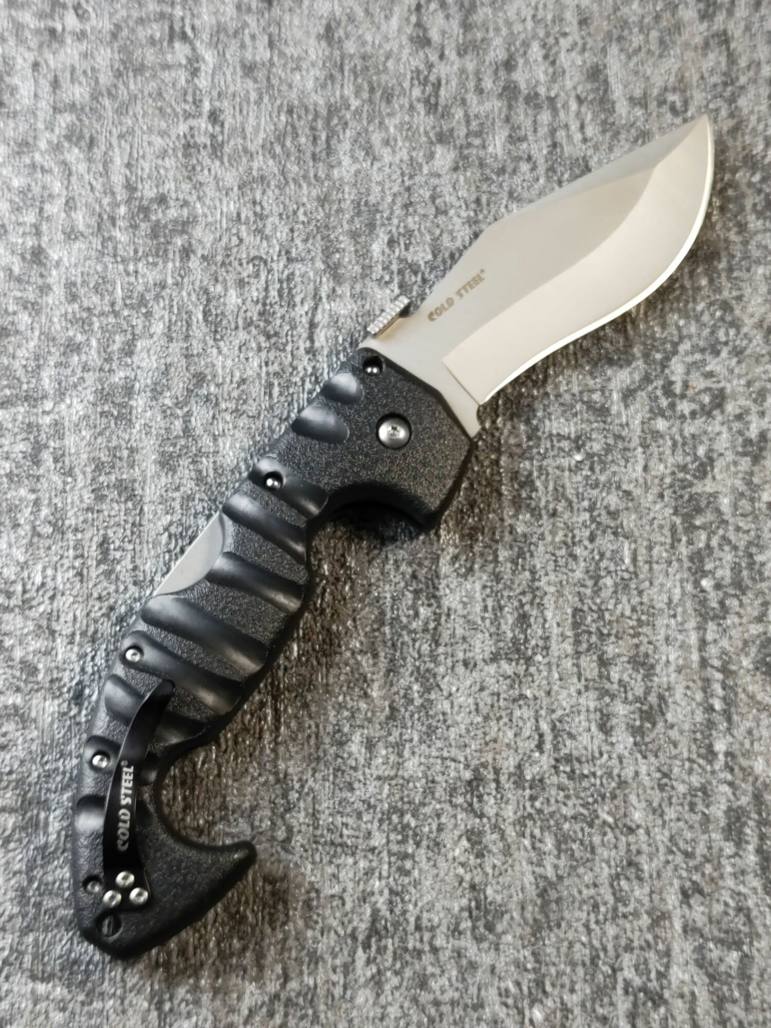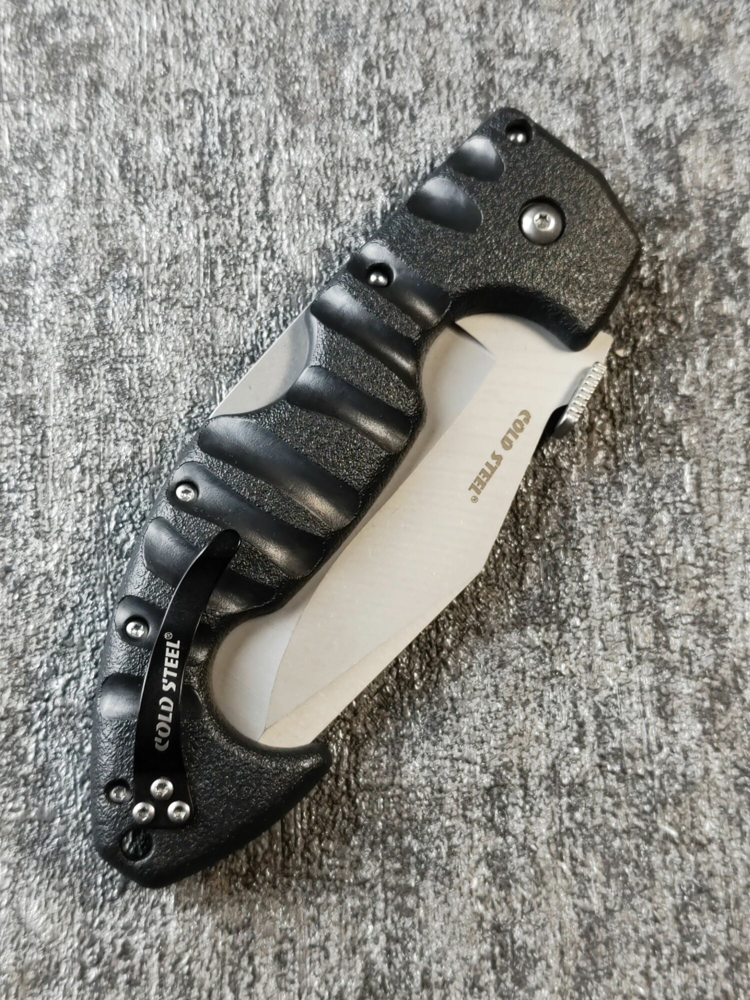 Рукоять выполнена из современного полимера Grivory, который обладает повышенной пожаробезопасностью, ударной прочностью при низких температурах, стойкостью к химическим веществам, противостоит порезам и не поглощает влагу. Она эргономична и удобна, усилена металлическими плашками. Держать рукоять удобно как прямым так и обратным хватом. В комлекте идёт запасная клипса, которую можно установить с любой стороны ножа.
