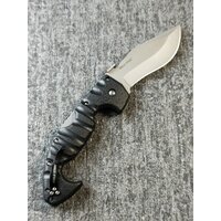 Клинок напоминает античный меч копис и выполнен из японской стали AUS-10A, которая отличается высокой износостойкостью, прочностью и твердостью, но незначительно подвержена коррозии. Финишная обработка клинка выполнена методом галтовки (Stonewash) для улучшения эксплуатационных качеств ножа и маскировки мелких царапин. Нож оснащён самым прочным ножевым замком в мире Tri-Ad Lock, созданным Эндрю Демко (Andrew Demko). Благодаря ему нож лишен люфтов, фактически превращаясь в полноценный фиксированный нож. Триад-лок выдерживает нагрузку до 280 кг, без разрушения, что является абсолютным рекордом для складных ножей. Сверху на клинке установлена специальная пластина, зацепив которую за карман, Вы извлекаете уже готовый к работе инструмент.