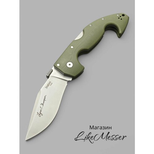Уникальный Cold Steel Spartan — складной нож, разработанный Эндрю Демко. Это внушительный складной тактический нож с большой рукоятью, которая обеспечивает максимально удобный и прочный хват, и клинком формы кукри. Дизайн этого ножа основан на мече из древней Спарты - Kopis. Уникальность данной версии заключается в наличии подписи Лина Томпсона на клинке - основателя Cold Steel. Форма клинка и рукояти Спартана практически полностью повторяет клинок и рукоять кописа. Серрейторный клинок извлекается с помощью пластины "Demko", расположенной на обухе. Также данная пластина может служить упором для больного пальца. Spartan также оснащён клипсой для удобного ношения.