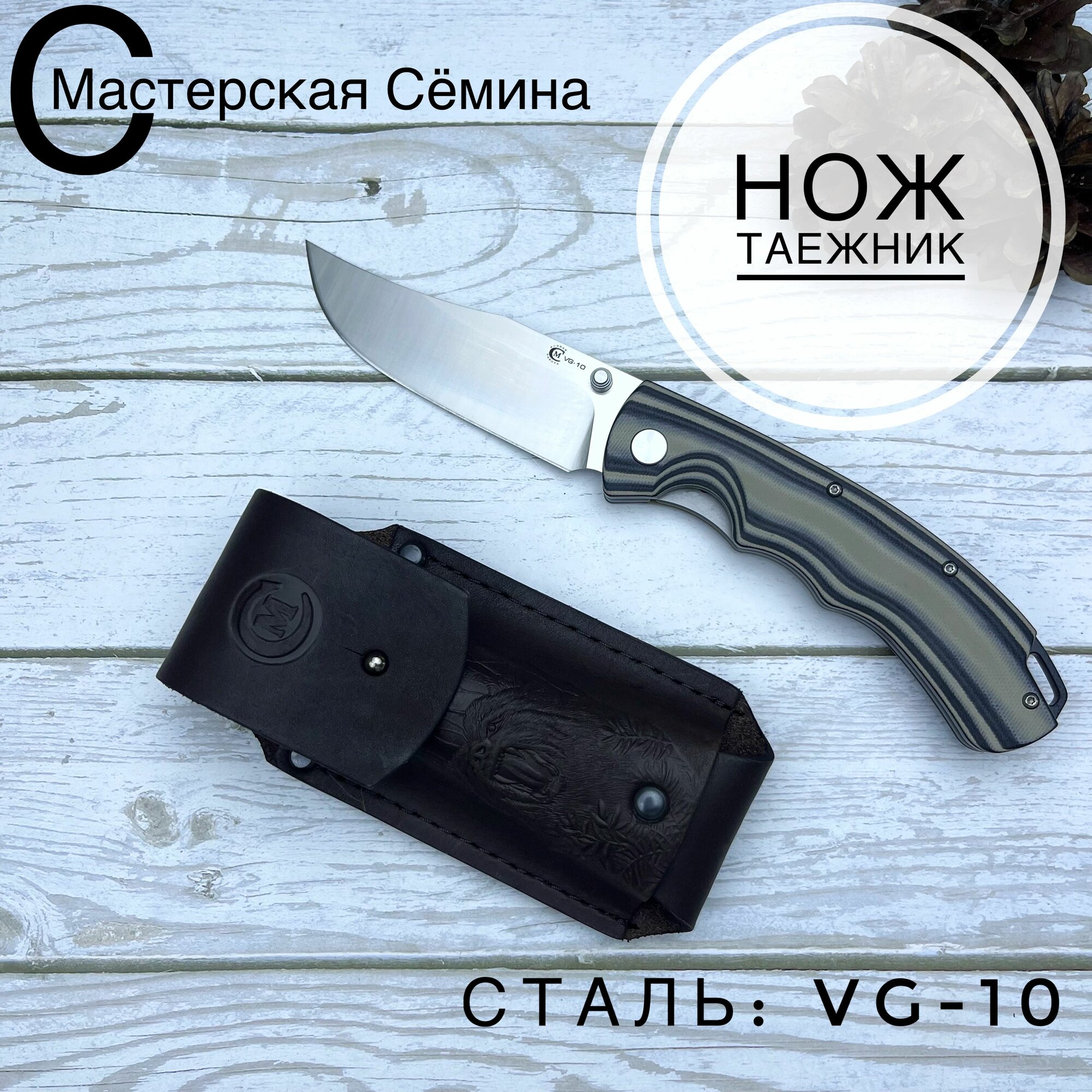 Нож складной из стали VG-10 таежник, рукоять пластик G10 (цвет черно-серая). Ножны из натуральной кожи. Официальный магазин производителя Мастерская Сёмина: сравнение цен, характеристики, фото, актуальное наличие и цены.