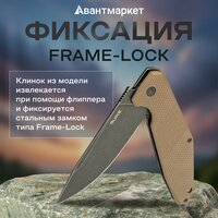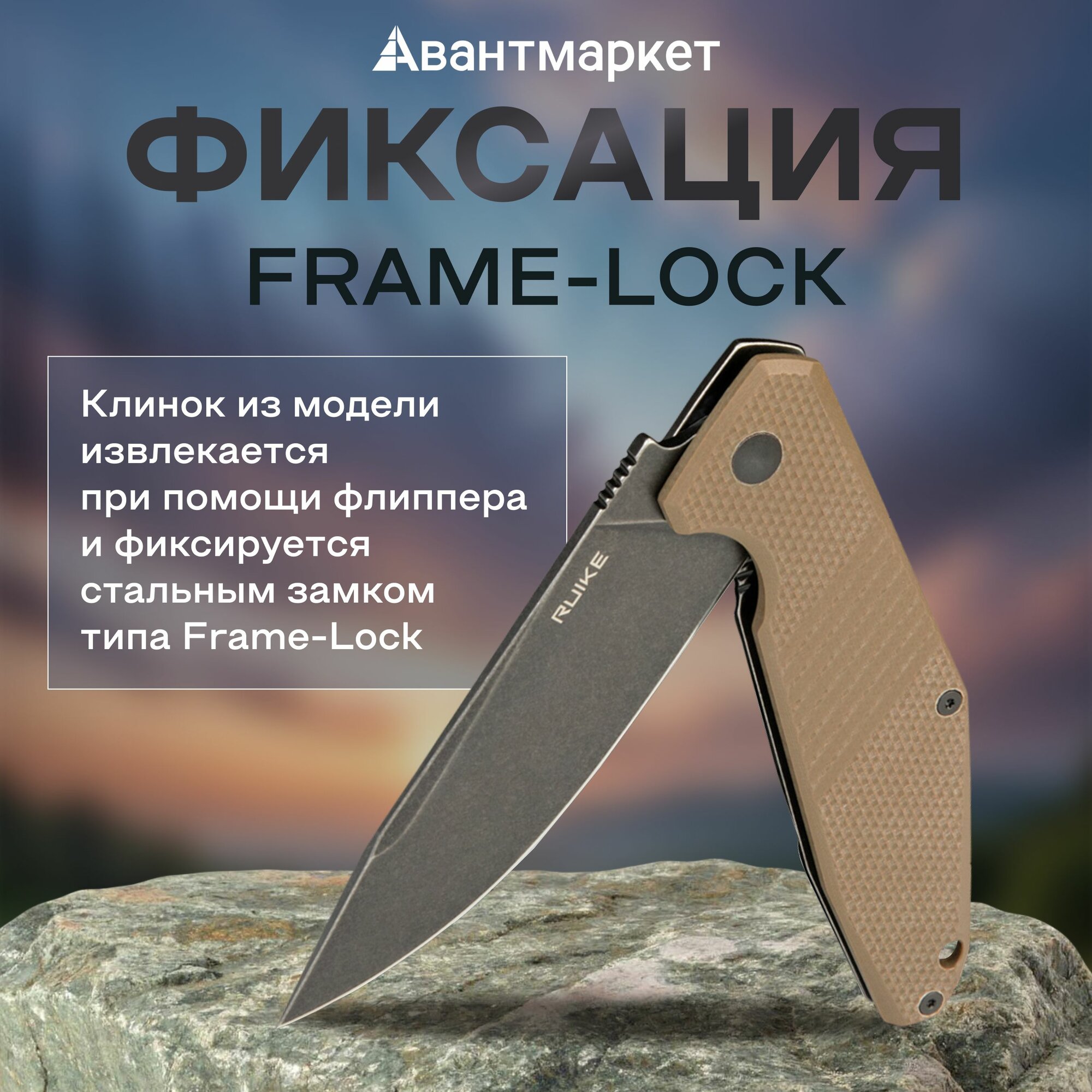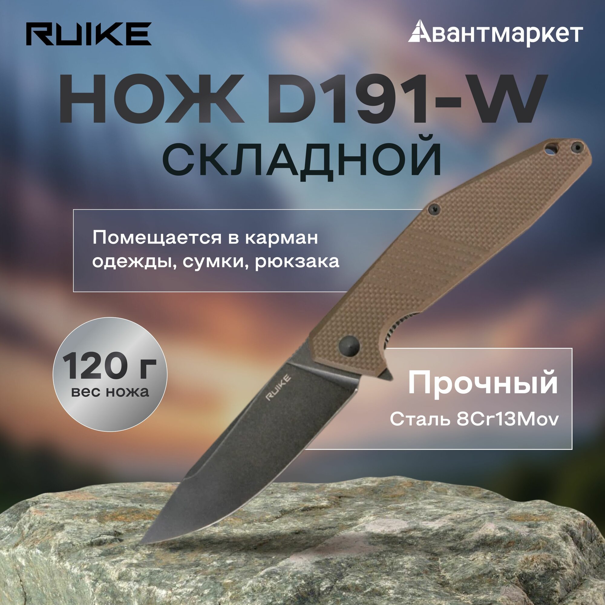 Общая длина ножа составляет 21,9 см. Длина лезвия — 9,2 см, а толщина — 3,5 мм. Весит модель 120 г. Клинок из модели извлекается при помощи флиппера и фиксируется стальным замком типа Frame-Lock. За скорость извлечения отвечает осевой роликовый подшипник. Модель идет в зеленом цвете. Нож Ruike D191-W коричневый пригодится в туризме, рыбалке, охоте и любом другом виде активного отдыха на природе.
