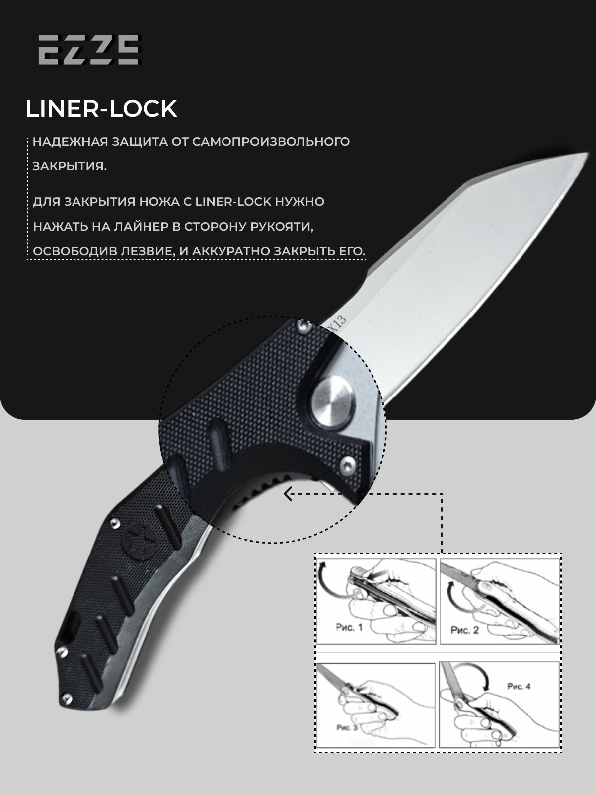 не относится к холодному оружию; марка стали: D2; твердость стали, HRC: 58-60; длина сложенного: 130 мм; чехол в комплекте: нет; заточка: прямая; тип замка: Liner Lock