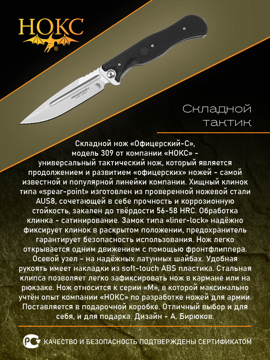 Нож складной НОКС офицерский-с (309-180975), сталь AUS8, рукоять ABS пластик: сравнение цен, характеристики, фото, актуальное наличие и цены.