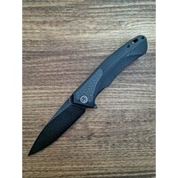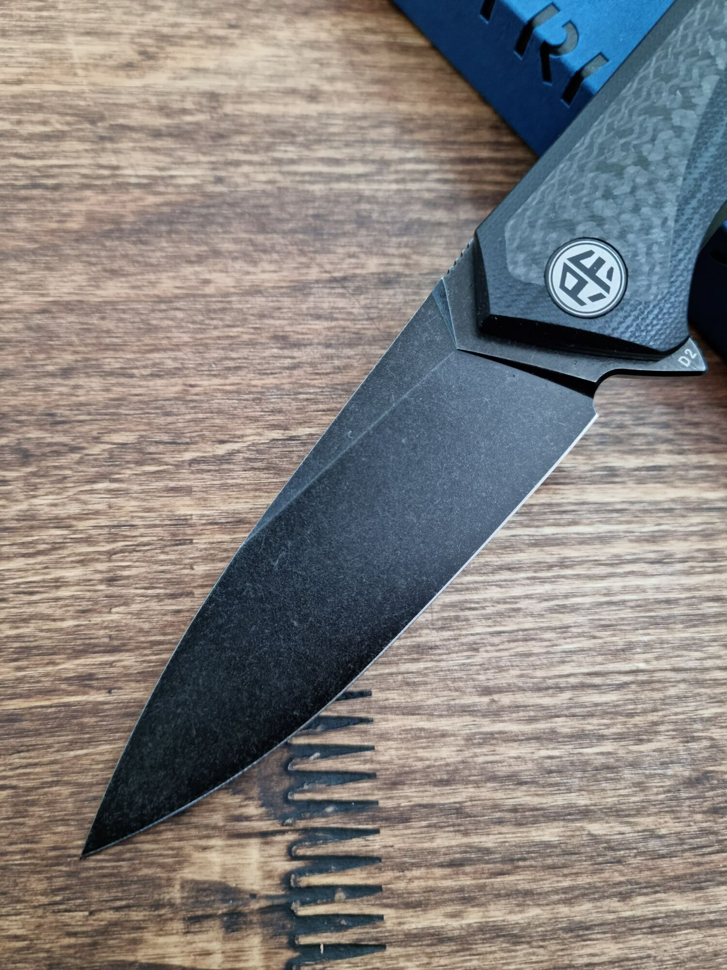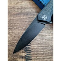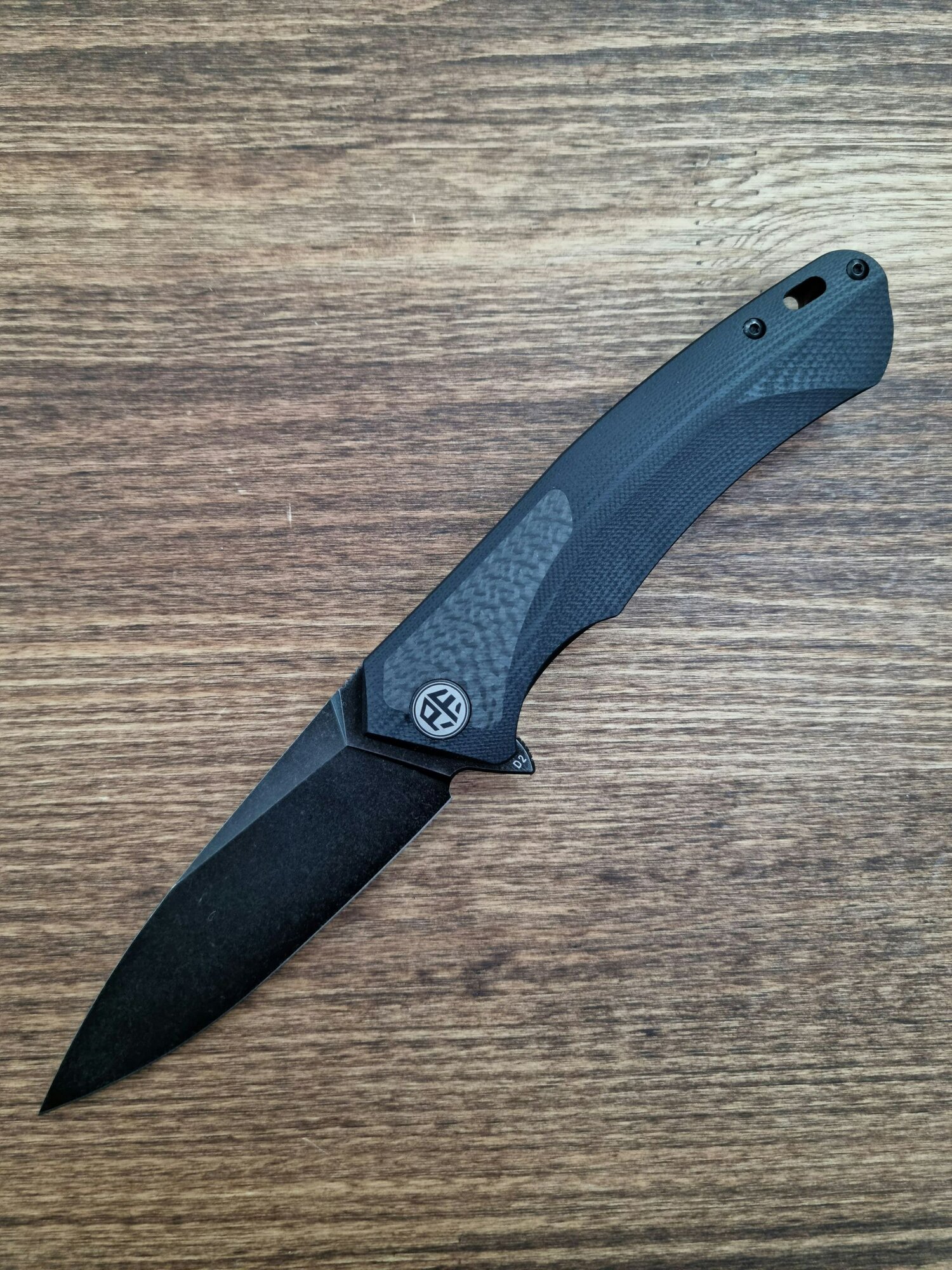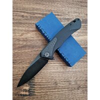 Характеристики: Модель: PF838 Общая длина: 220 мм Длина клинка: 95 мм Толщина обуха: 3,9 мм Ширина клинка: 29 мм Марка стали: D2 Обработка лезвия: Black stonewash Материал рукояти: Carbon fiber / G10 Твердость клинка: 59-60 HRC Система: Керамический шарикоподшипник Вес: 167 гр