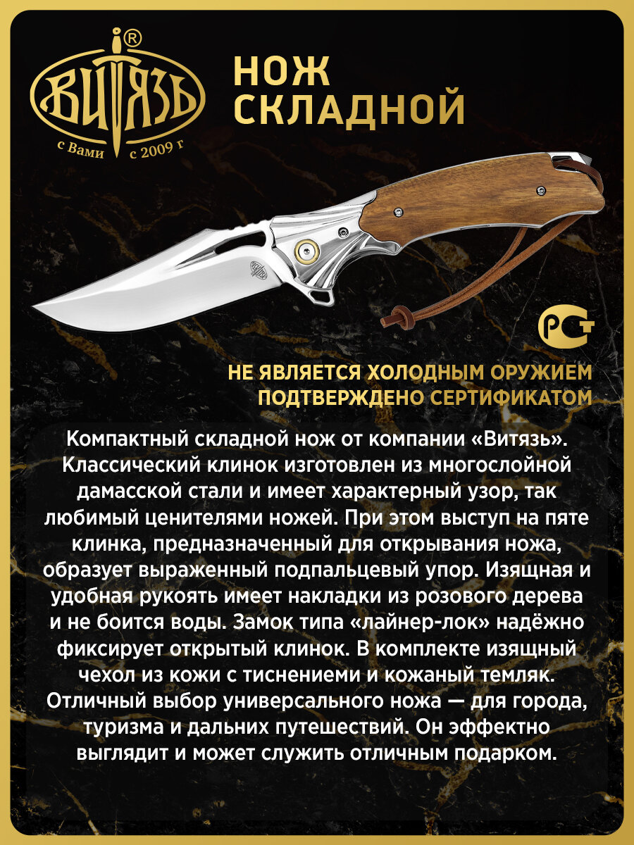 Компактный складной нож от компании "Витязь". Классический клинок изготовлен из многослойной дамасской стали и имеет характерный узор, так любимый ценителями ножей. При этом выступ на пяте клинка, предназначенный для открывания ножа, образует выраженный подпальцевый упор. Изящная и удобная рукоять имеет накладки из розового дерева и не боится воды. Замок типа "лайнер-лок" надёжно фиксирует открытый клинок. В комплекте изящный чехол из кожи с тиснениеми и кожаный темляк. Отличный выбор универсального ножа- для города, туризма и дальних путешествий. Он эффектно выглядит и может служить отличным подарком.