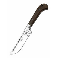 Этот нож сделан по мотивам традиционного азиатского ножа "Пчак". Клинок с прямым обухом и плавным подъёмом лезвия к острию прямыми высокими спусками сделан из высококачественной легированной стали. Нож подходит для выполнения различных задач. Благодаря удачному строю клинка нож хорошо колет, однако главным его назначением будет точный контролируемый рез. Эргономичная рукоять из дерева, с широким темлячным отверстием, прекрасно лежит в ладони и снабжена простым и надёжным замком "liner-lock". "Пчак 120" может исполнять роль как ножа "на каждый день", так и походного инструмента. Для комфортного использования нож комплектуется удобным чехлом.